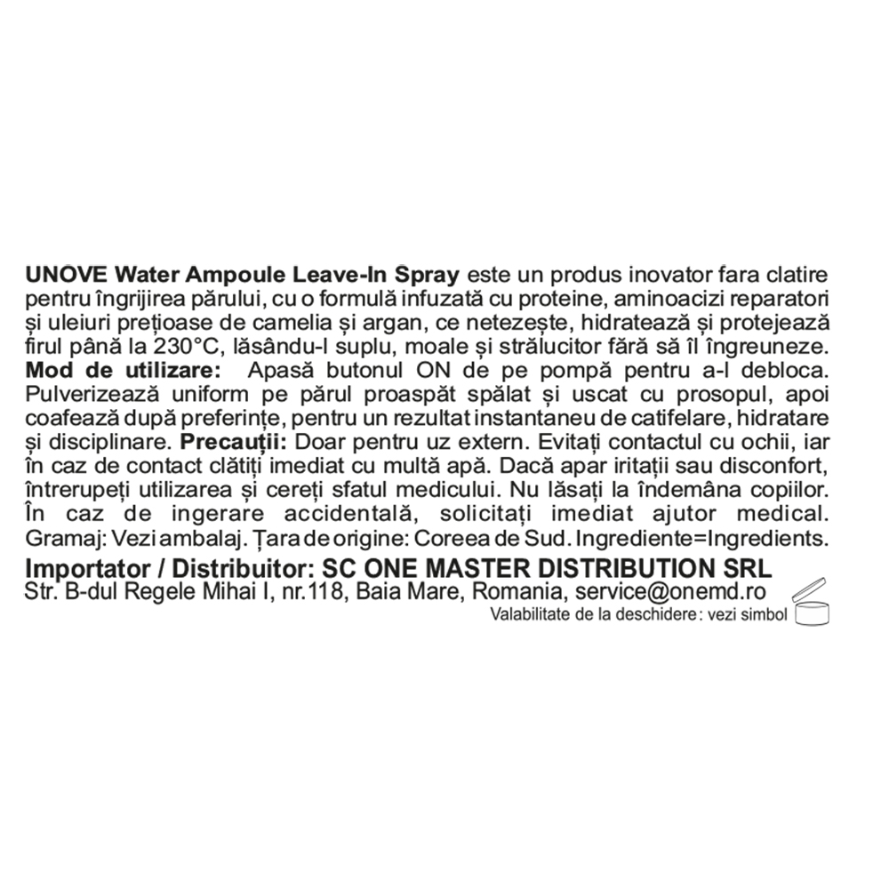 Farmacia Tei intelege importanta informatiilor prezentate in aceasta pagina si face eforturi permanente pentru a le pastra actualizate. Singura situatie in care informatiile prezentate despre Spray leave-in cu protectie termica Water Ampoule Treatment, 200 ml, Unove pot fi diferite fata de cele prezentate pe site este aceea in care producatorul/importatorul aduce modificari specificatiilor/etichetei acestuia, fara a ne informa in prealabil. In cazul aparitiei unor diferente, prevaleaza informatia de pe etichetele produsului fizic.