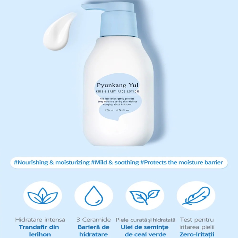 - lotiune de fata delicata si eficienta, formulata pentru a hidrata si proteja pielea sensibila a copiilor;