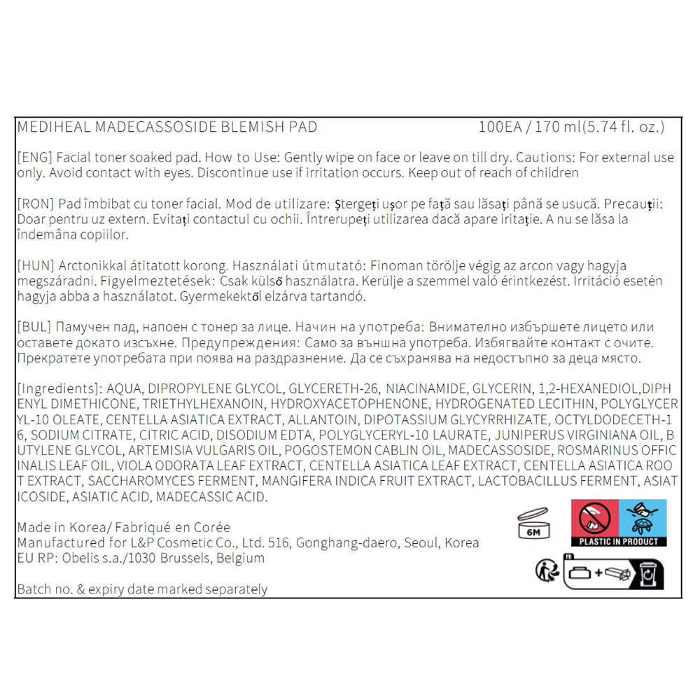 - dischete tonice cu Madecassoside si Centella Asiatica, care contribuie la calmarea pielii si la reducerea imperfectiunilor si la mentinerea aspectului uniform al tenului;