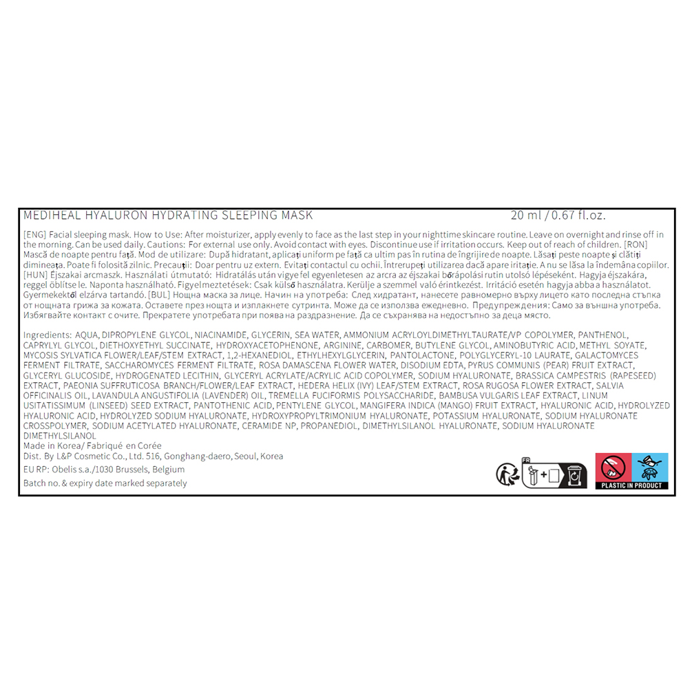 Ingrediente active:- Acid hialuronic - Hidrateaza intens si ajuta la mentinerea apei in piele pentru un ten mai plin si mai neted pana dimineata