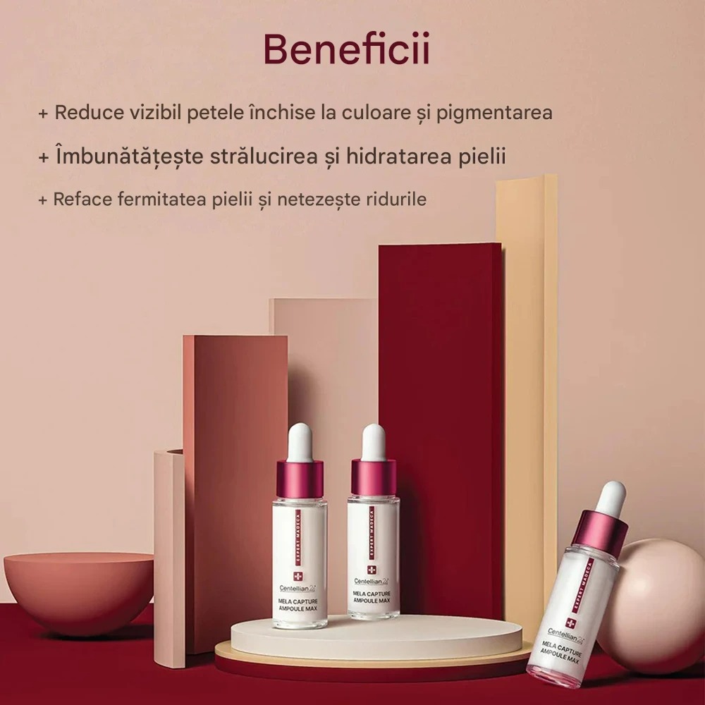 - Centellian24 Expert Madeca Mela Capture Ampoule Max este un ser concentrat, conceput pentru a corecta nuanta neuniforma a pielii si a reduce petele pigmentare;