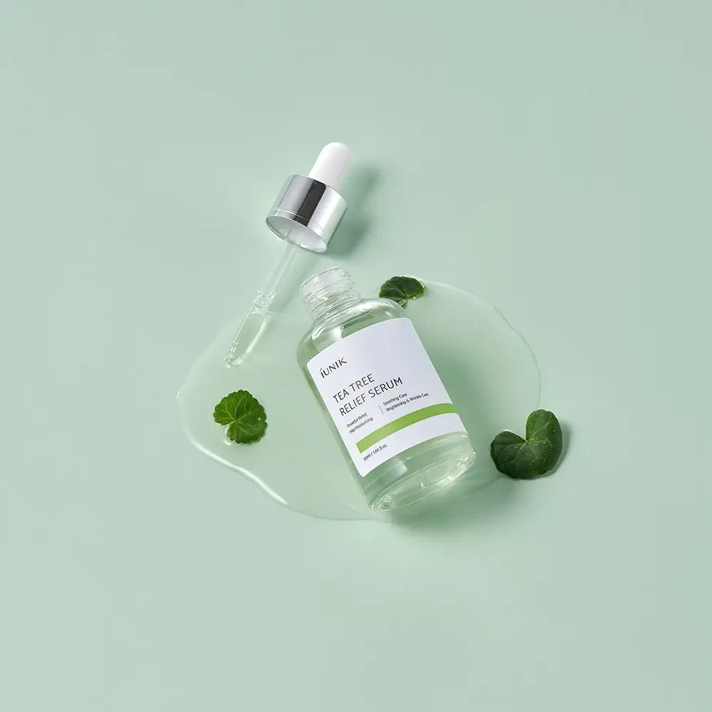 - serul facial calmant iUNIK Tea Tree Relief are in compozitia sa 67 % extract de apa din frunzele arborelui de ceai si 19.5% extract de Cetella Asiatica oferind o ingrijire eficienta pentru calmarea pielii sensibile si pentru un ton clar si curat al pielii;