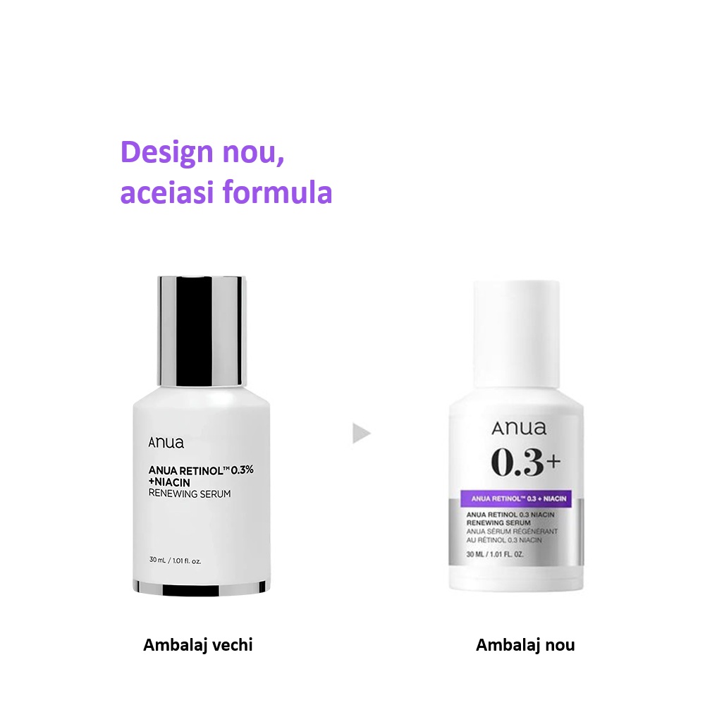- Anua Retinol 0.3 + Niacin Renewing Serum este un ser creat pentru imbunatatirea texturii si a aspectului liniilor fine;