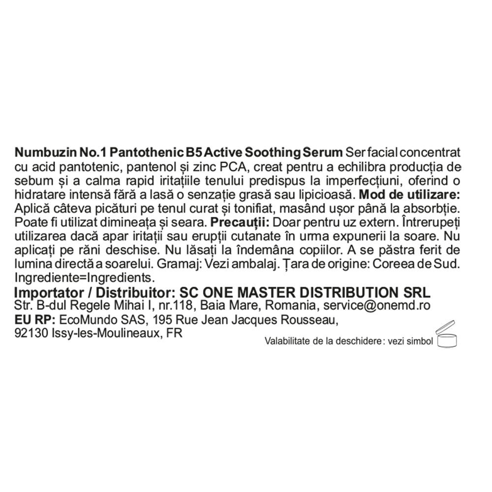 Formula are la baza acidul pantotenic (Vitamina B5), care regleaza secretia de sebum si accelereaza procesul de recuperare a pielii, fiind completata de Panthenol si Zincul PCA pentru a purifica porii si a preveni aparitia noilor eruptii. Serul include un complex vast de extracte botanice, precum Centella Asiatica, radacina de lemn dulce si Sophora Angustifolia, care calmeaza instantaneu inflamatia si reduc roseata. Prezenta Niacinamidei si a Alpha-Arbutinei ajuta la uniformizarea nuantei tenului si la estomparea semnelor post-acneice, in timp ce formele multiple de Acid Hialuronic asigura o hidratare densa in straturile epidermului.