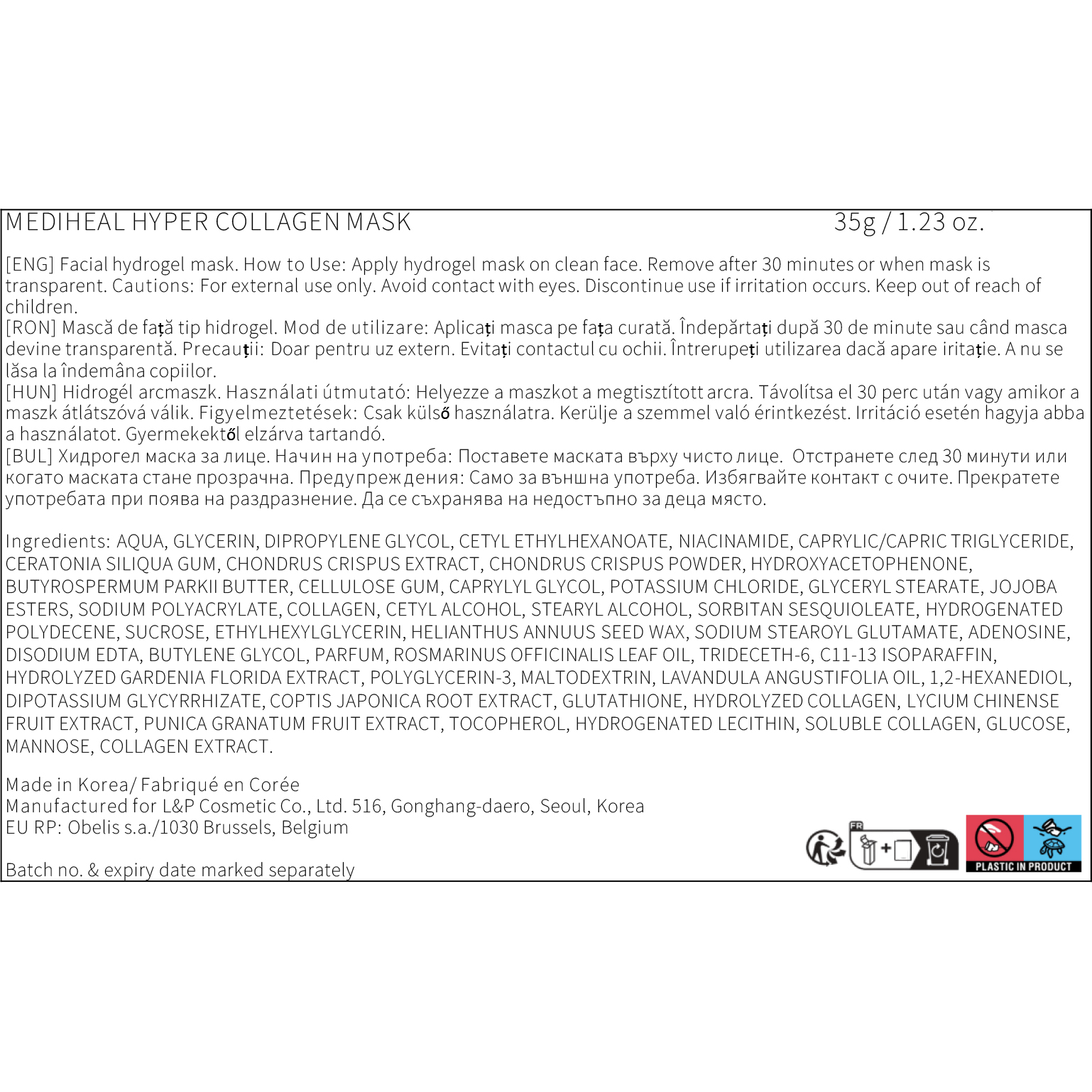 - Mediheal Hyper Collagen Mask este o masca din hidrogel cu efect de fermitate, conceputa pentru a sustine elasticitatea si pentru a imbunatati aspectul pielii care si-a pierdut tonusul;