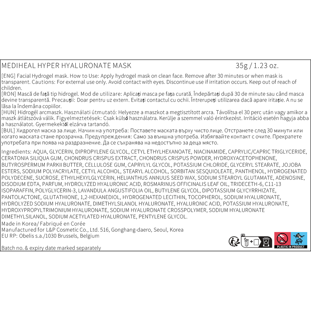 - Mediheal Hyper Hyaluronate Mask este o masca hidrogel conceputa pentru hidratarea intensa si revitalizarea pielii deshidratate;