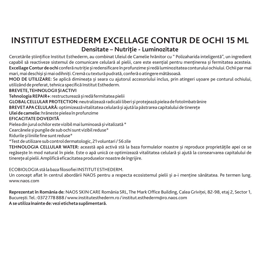 Informatii utile despre Crema contur de ochi Excellage, 15 ml, Institut Esthederm gasiti in articolele: Rutina zilnica de ingrijire corporala. Crema contur de ochi Excellage 15 ml Institut Esthederm (ofera fermitate si luminozitate) si are indicații in:cearcane, pungile de sub ochi (edem infraorbital).