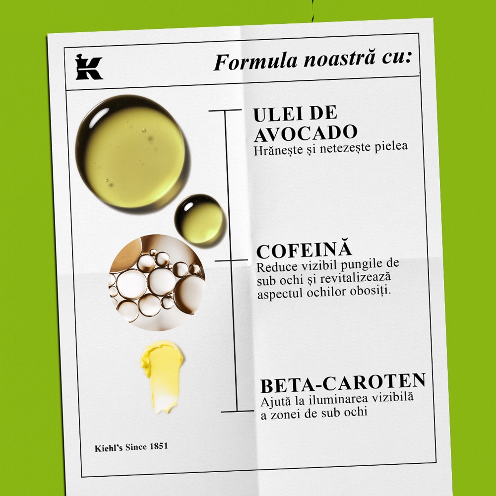 Crema hidratantă de ochi cu Avocado de la Kiehl's este o sursă intensă de hidratare pentru zona delicată din jurul ochilor. Formula acesteia, îmbogățită cu Ulei de Avocado, Unt de Shea și Beta-Caroten, oferă hidratare profundă și durabilă. Este potrivită pentru toate tipurile de piele, inclusiv pentru cea sensibilă.