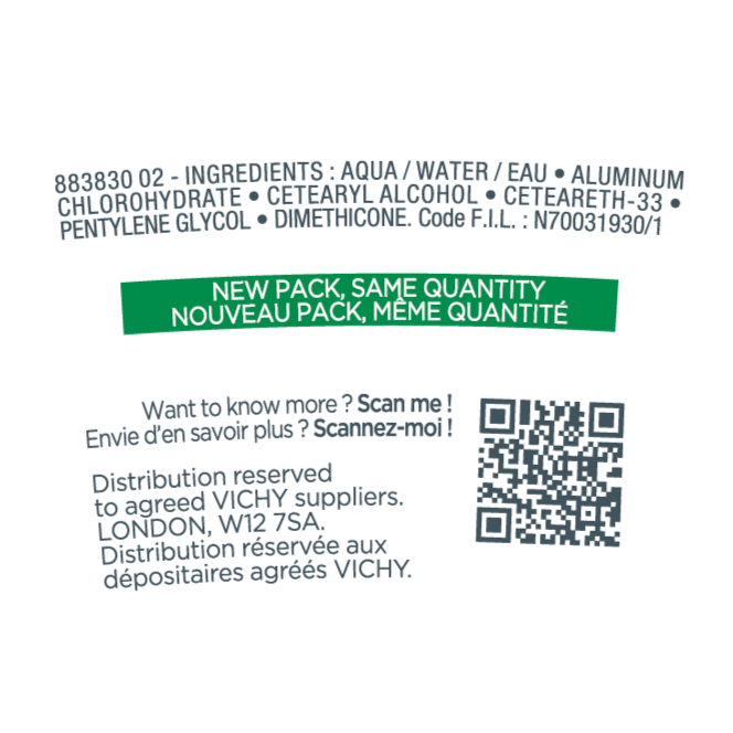 Ingrediente:Aqua / Water / Eau, Aluminum Chlorohydrate, Cetearyl Alcohol, Ceteareth-33, Pentylene Glycol, Dimethicone.