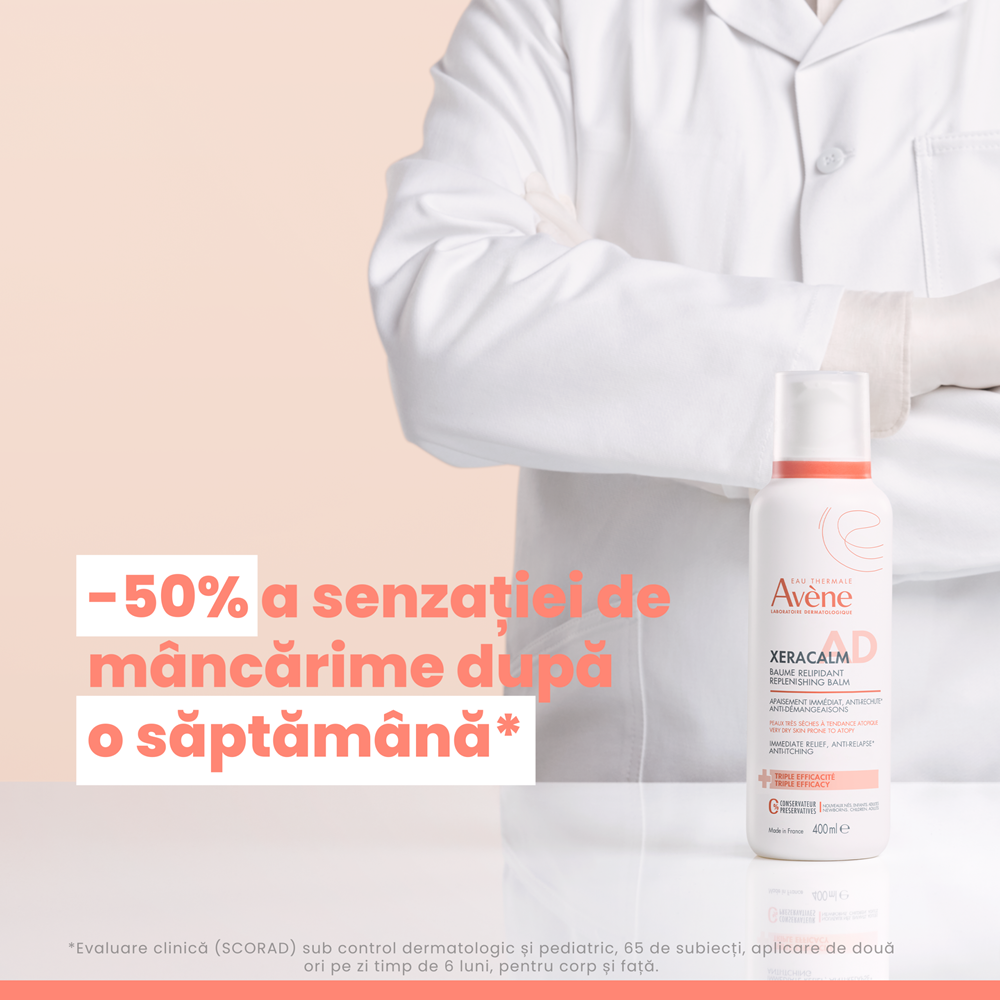 Disclaimere: 1. Timp mediu pentru ca mâncărimea să dispară. Studiu de fază IV pe 1711 pacienți - Franța, teritoriile de peste mări și Italia - pentru 75% dintre pacienții care utilizează doar îngrijirea XeraCalm AD de 1 până la 2 ori pe zi timp de 7 zile în indicația xerozei pruriginoase.