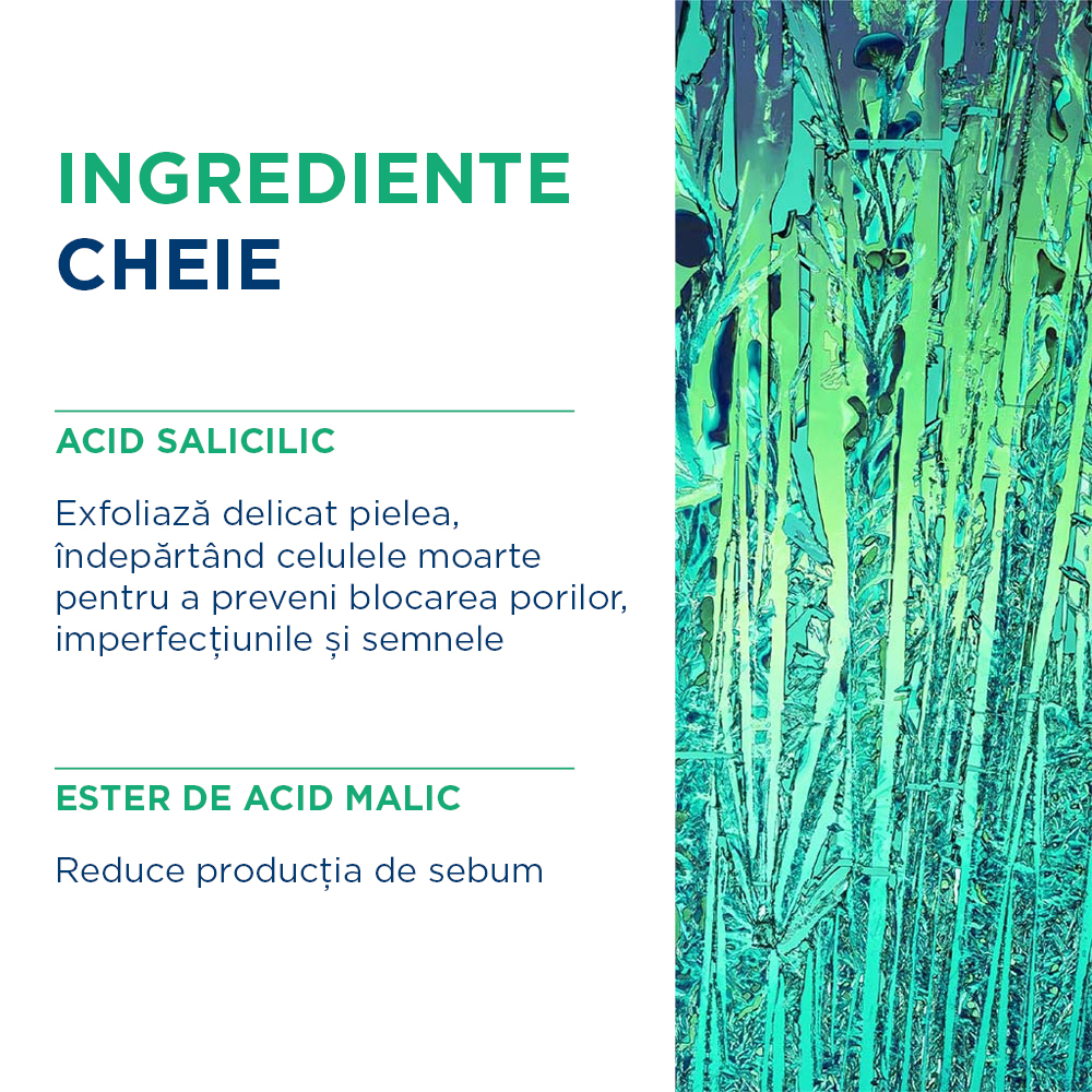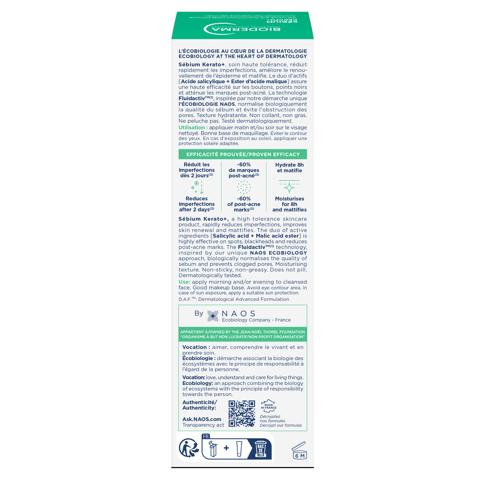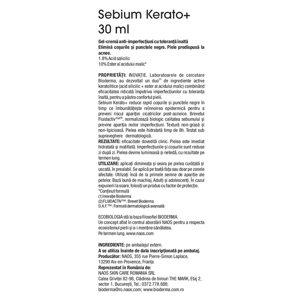 - Sebium Kerato+ reduce rapid petele și punctele negre în timp ce îmbunătățește reînnoirea epidermică pentru a preveni riscul apariției cicatricilor post-acneice. - brevetul Fluidactiv™ , normalizează biologic calitatea sebumului și previne apariția noilor imperfecțiuni;