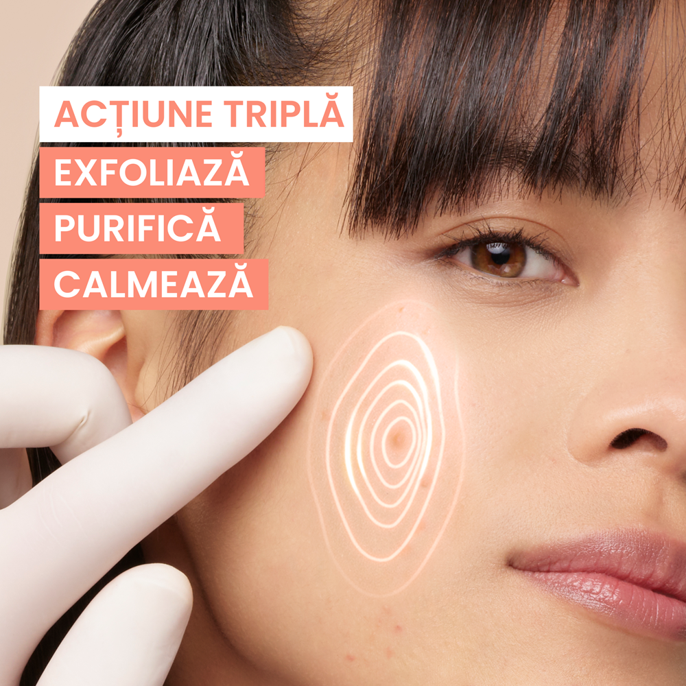 - actiunea sa exfolianta superficiala ajuta la reducerea treptata a imperfectiunilor, desfundarea porilor, eliminarea excesului de sebum, purificarea si netezirea pielii datorita unei formule concentrate in ingrediente active dermatologice;