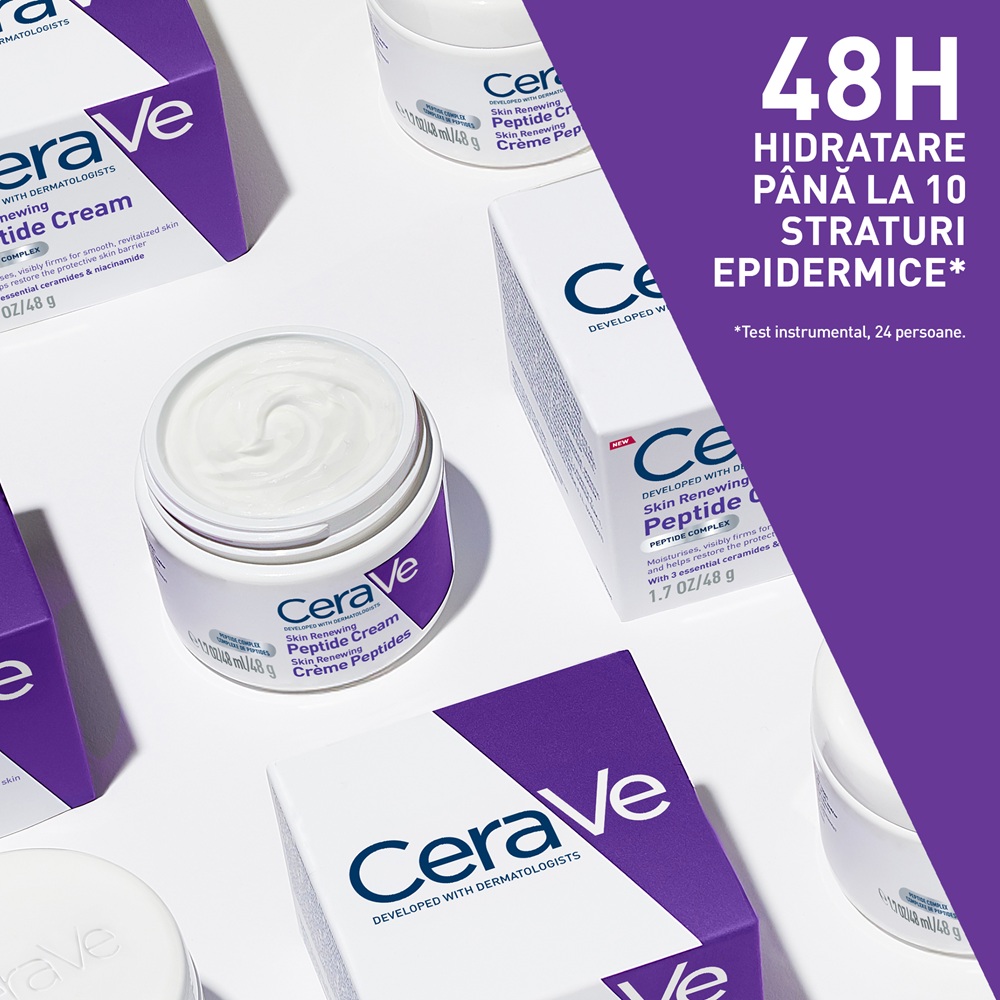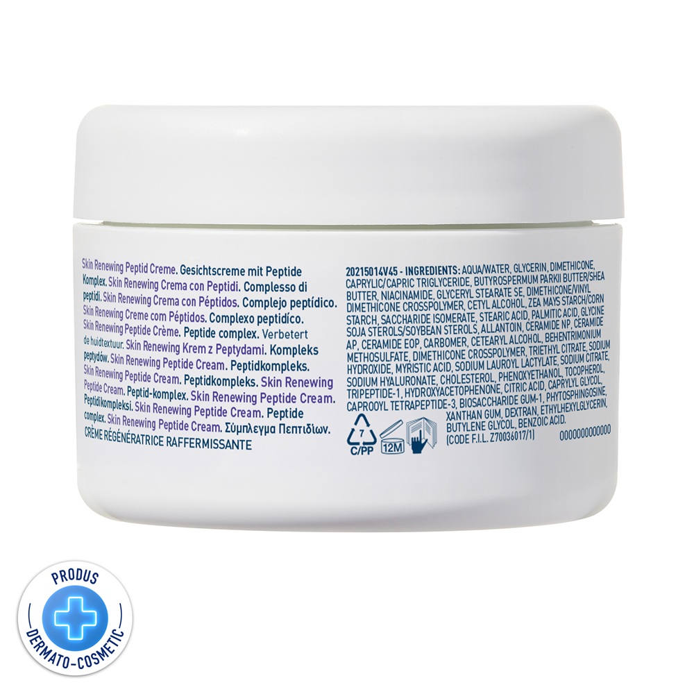 - dezvoltata impreuna cu medicii dermatologi, crema cu peptide, hidrateaza si ofera fermitate pentru o piele vizibil mai neteda si revitalizata, in timp ce ajuta la restabilirea barierei protectoare a pielii;