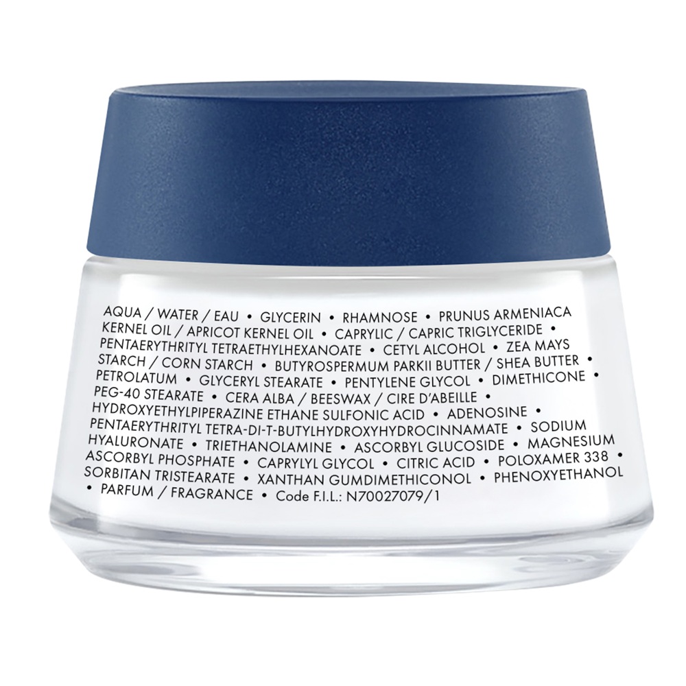 Aqua / Water / Eau, Glycerin, Rhamnose, Prunus Armeniaca Kernel Oil / Apricot Kernel Oil, Caprylic / Capric Triglyceride, Pentaerythrityl Tetraethylhexanoate, Cetyl Alcohol, Zea Mays Starch / Corn Starch, Butyrospermum Parkii Butter / Shea Butter, Petrolatum, Glyceryl Stearate, Pentylene Glycol, Dimethicone, PEG-40 Stearate, Cera Alba / Beeswax / Cire Dabeille, Hydroxyethylpiperazine Ethane Sulfonic Acid, Adenosine, Pentaerythrityl Tetra-Di-T-Butyl Hydroxyhydrocinnamate, Sodium Hyaluronate, Triethanolamine, Ascorbyl Glucoside, Magnesium Ascorbyl Phosphate, Caprylyl Glycol, Citric Acid, Poloxamer 338, Sorbitan Tristearate, Xanthan Gum, Dimethiconol, Phenoxyethanol, Parfum / Fragrance.