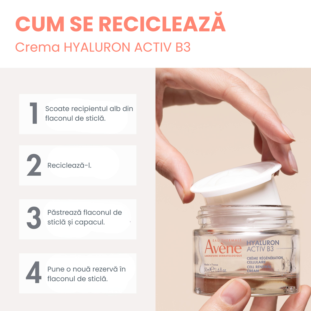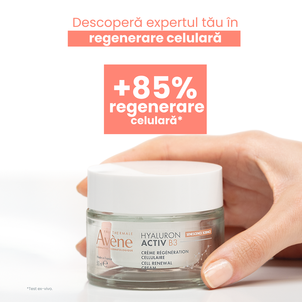 Odată cu vârsta, totul este pe repede înainte. Celulele îmbătrânite se răspândesc iar pielea nu mai are același tonus. Laboratoarele Dermatologice Avène creează Hyaluron Activ B3 Cremă pentru regenerare celulară cu 0,2% acid hialuronic pur (greutate moleculară mare și mică) și 6% niacinamidă pentru a acționa asupra cauzei îmbătrânirii și a prelungi viața celulelor2. De la prima aplicare, pielea este mai plină și iluminată. După 15 zile, pielea este regenerată, mai fermă și ridurile sunt corectate3.