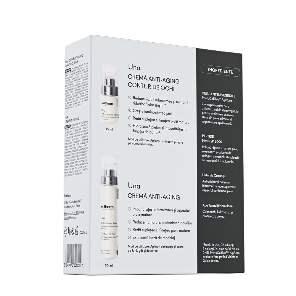 Aplicati dimineata si seara pe pielea curata din jurul ochilor UNA crema anti-aging contur de ochi si continuati rutina cu UNA crema anti-aging fata pentru fata, gat si decolteu.