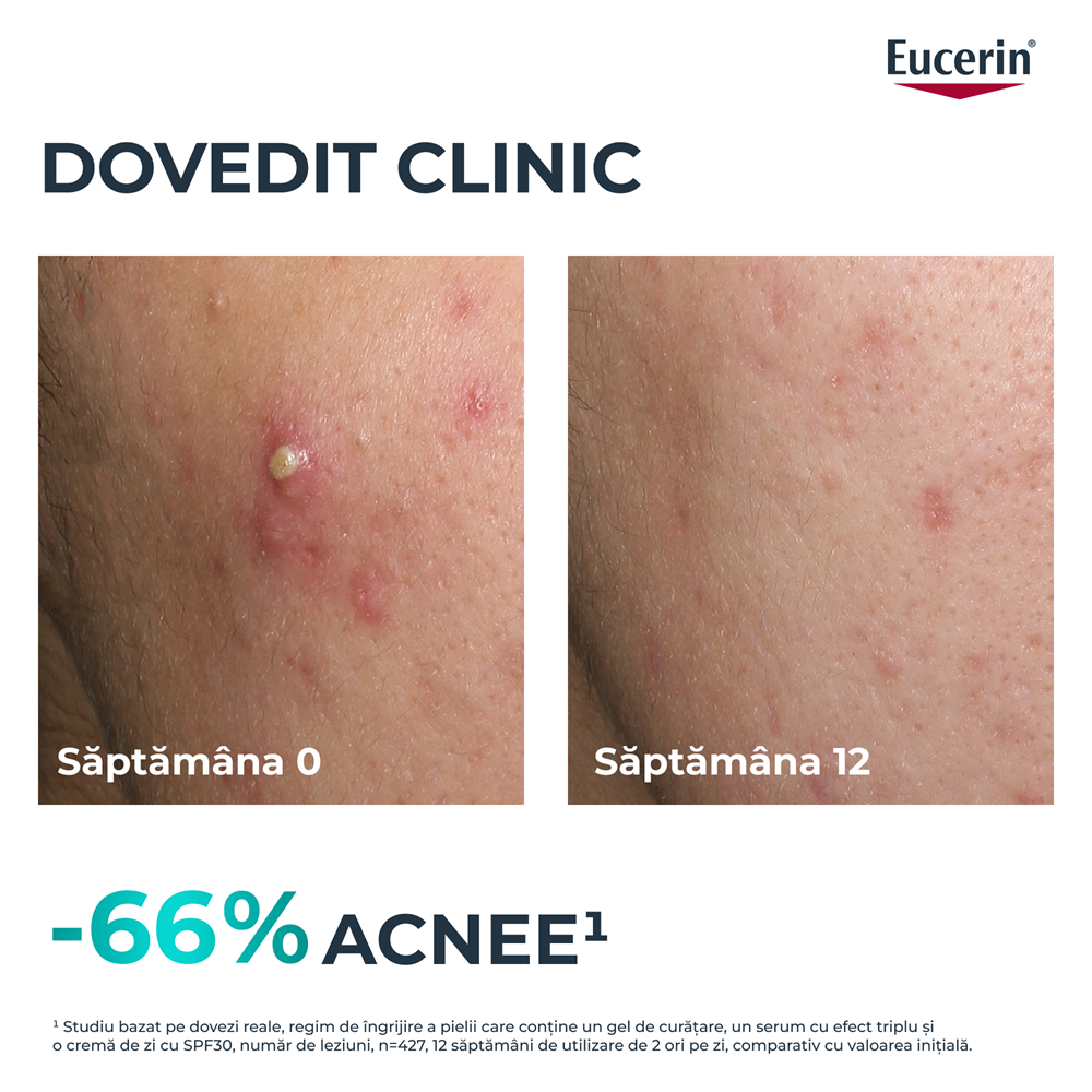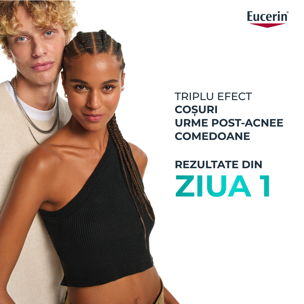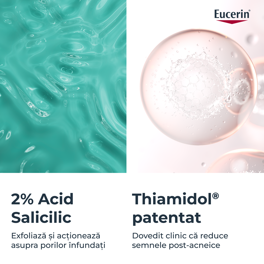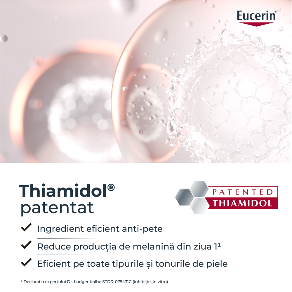 Thiamidol: ingredient brevetat Eucerin, dezvoltat timp de 10 ani, dovedit clinic si dermatologic ca reduce urmele post-acnee si previne reaparitia acestora prin reducerea productiei de melanina, cu efect vizibil din prima zi.