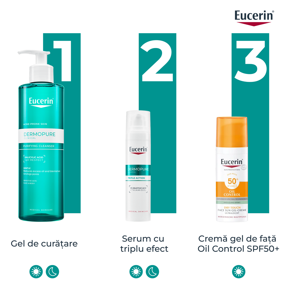 Aplica o pompa de produs de doua ori pe zi pe pielea uscata, dupa curatarea cu gelul de curatare Eucerin Dermo Pure.