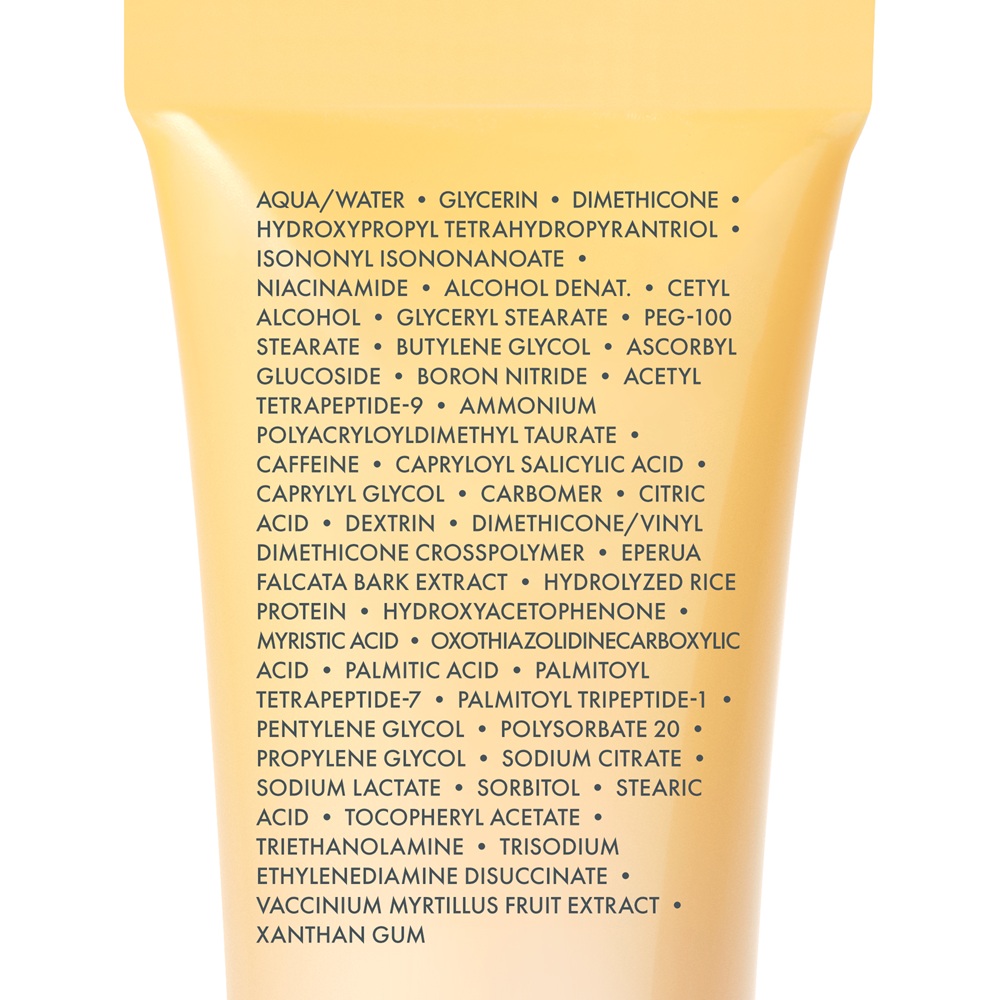 Aqua / Water / Eau, Glycerin, Dimethicone, Hydroxypropyl Tetrahydropyrantriol, Isononyl Isononanoate, Niacinamide, Alcohol Denat., Cetyl Alcohol, Glyceryl Stearate, PEG-100 Stearate, Butylene Glycol, Ascorbyl Glucoside, Boron Nitride, Acetyl Tetrapeptide-9, Ammonium Polyacryloyldimethyl Taurate, Caffeine, Capryloyl Salicylic Acid, Caprylyl Glycol, Carbomer, Citric Acid, Dextrin, Dimethicone / Vinyl Dimethicone Crosspolymer, Eperua Falcata Bark Extract, Hydrolyzed Rice Protein, Hydroxyacetophenone, Myristic Acid, Oxothiazolidinecarboxylic Acid, Palmitic Acid, Palmitoyl Tetrapeptide-7, Palmitoyl Tripeptide-1, Pentylene Glycol, Polysorbate 20, Propylene Glycol, Sodium Citrate, Sodium Lactate, Sorbitol, Stearic Acid, Tocopheryl Acetate, Triethanolamine, Trisodium Ethylenediamine Disuccinate, Vaccinium Myrtillus Fruit Extract, Xanthan Gum.