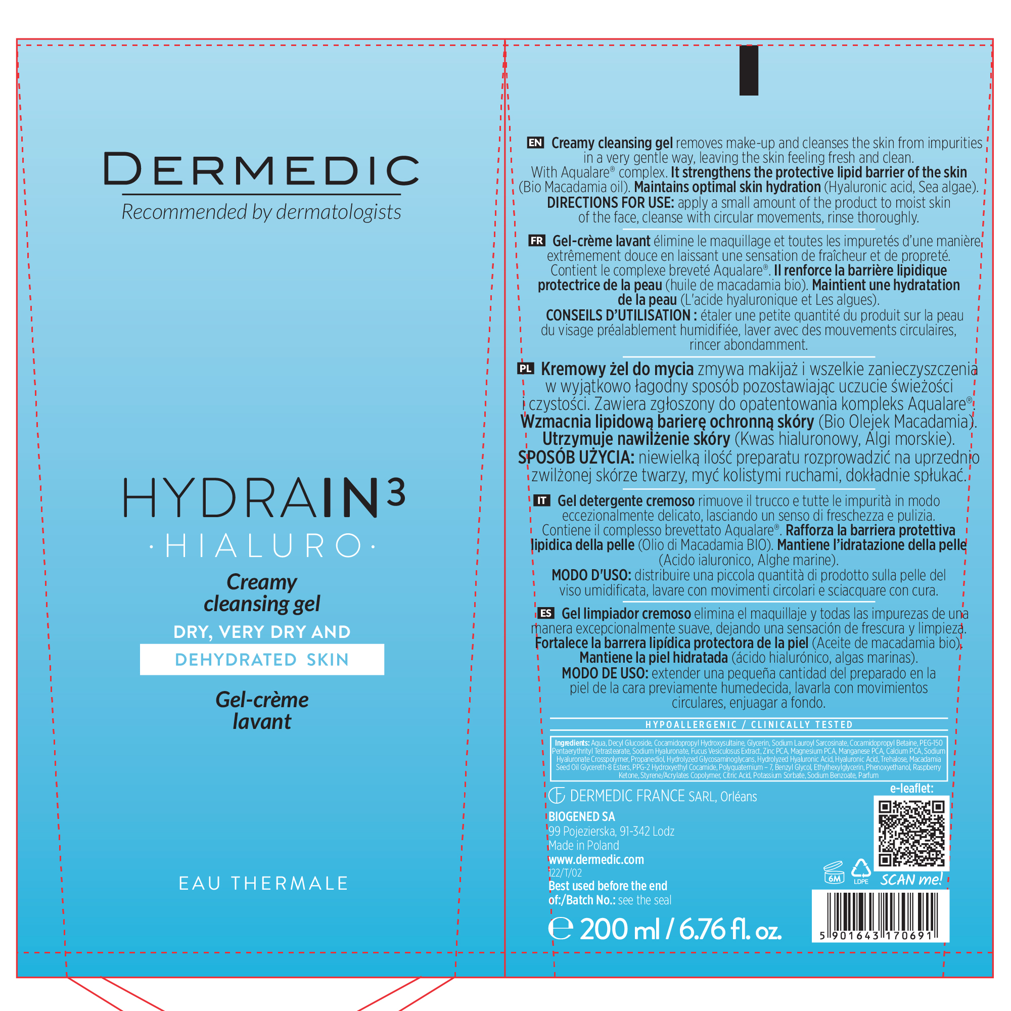 Aqua, Decyl Glucoside, Sodium Lauroyl Sarcosinate, Cocamidopropyl Hydroxysultaine, Cocamidopropyl Betaine, Glycerin, PEG-150 Pentaerythrityl Tetrastearate, PPG-2 Hydroxyethyl Cocamide, Sodium Hyaluronate, Polyquaternium – 7, Styrene/Acrylates Copolymer, Trehalose, Macadamia Seed Oil Glycereth-8 Esters, Algae Extract, Zinc PCA, Magnesium PCA, Manganese PCA, Calcium PCA, Sodium Hyaluronate Crosspolymer, Propanediol, Hydrolyzed Glycosaminoglycans, Hydrolyzed Hyaluronic Acid, Hyaluronic Acid, Benzyl Glycol, Ethylhexylglycerin, Phenoxyethanol, Raspberry Ketone, Citric Acid, Potassium Sorbate, Sodium Benzoate, Parfum.