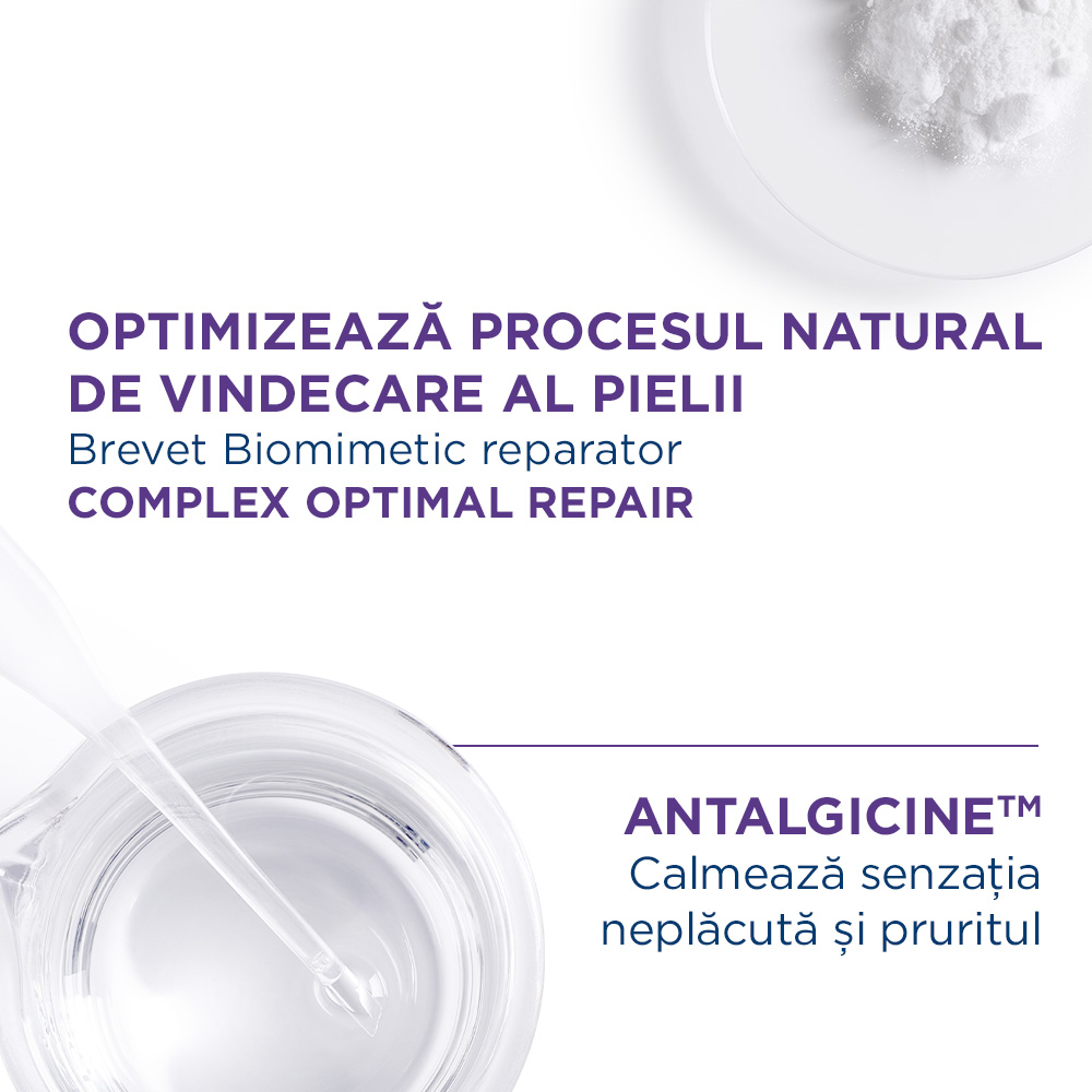 - respecta ciclul natural de vindecare prin protejarea pielii de agresiuni externe datorita texturii cu „efect de pansament”, prin calmarea senzatiilor de durere si prurit datorita tehnologiei ANTAGLICINE™ si prin refacerea microbiomului pielii, esential pentru o buna vindecare;