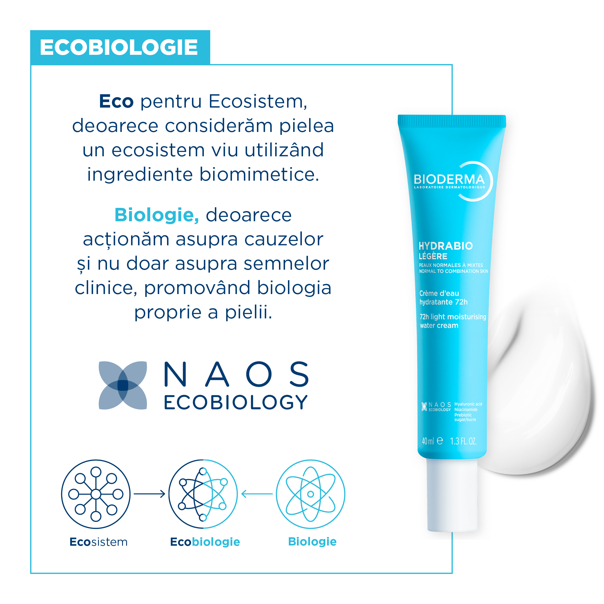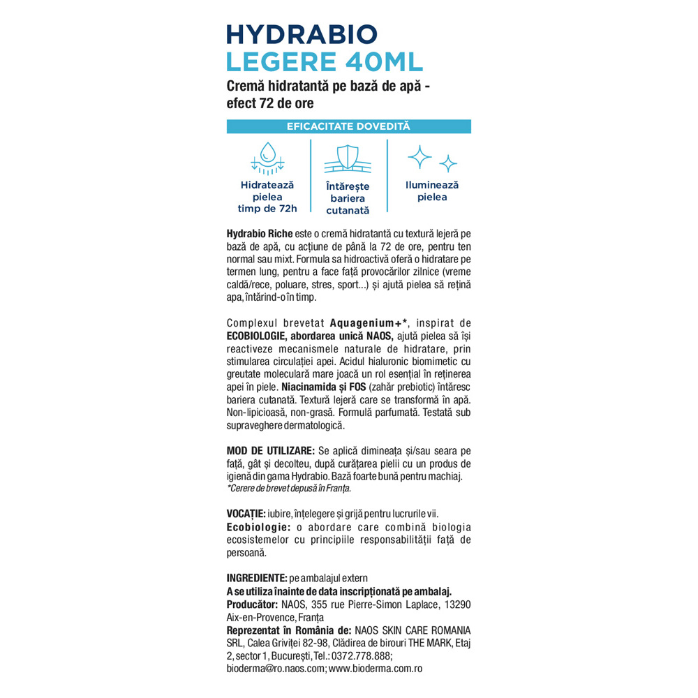 - complexul brevetat Aquagenium+, inspirat de ECOBIOLOGIE, abordarea unica NAOS, ajuta pielea sa isi reactiveze mecanismele naturale de hidratare, prin stimularea circulatiei apei;