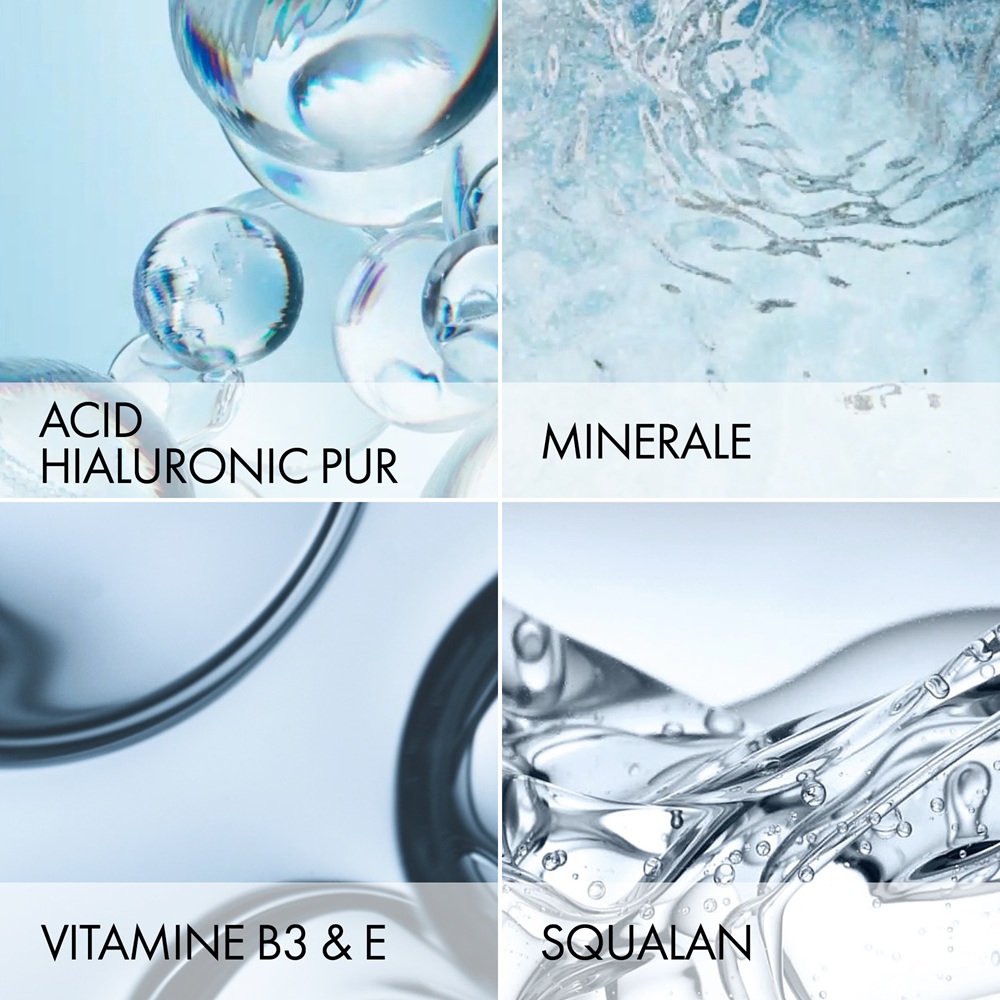 Ingrediente active:Acid hialuronic: acest ingredient s-a evidentiat prin capacitatea sa de hidratare si umplere, fiind capabil de a retine pana la 1000 de ori propria greutate in apa. Dimensiunea sa moleculara depaseste diamtrul porilor, formand o bariera de protectie la suprafata pielii.