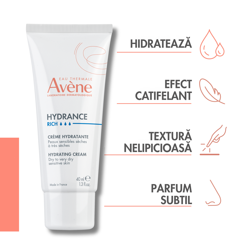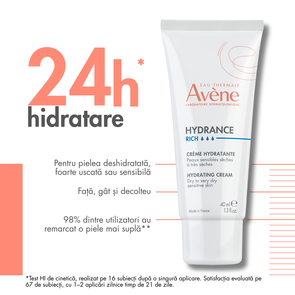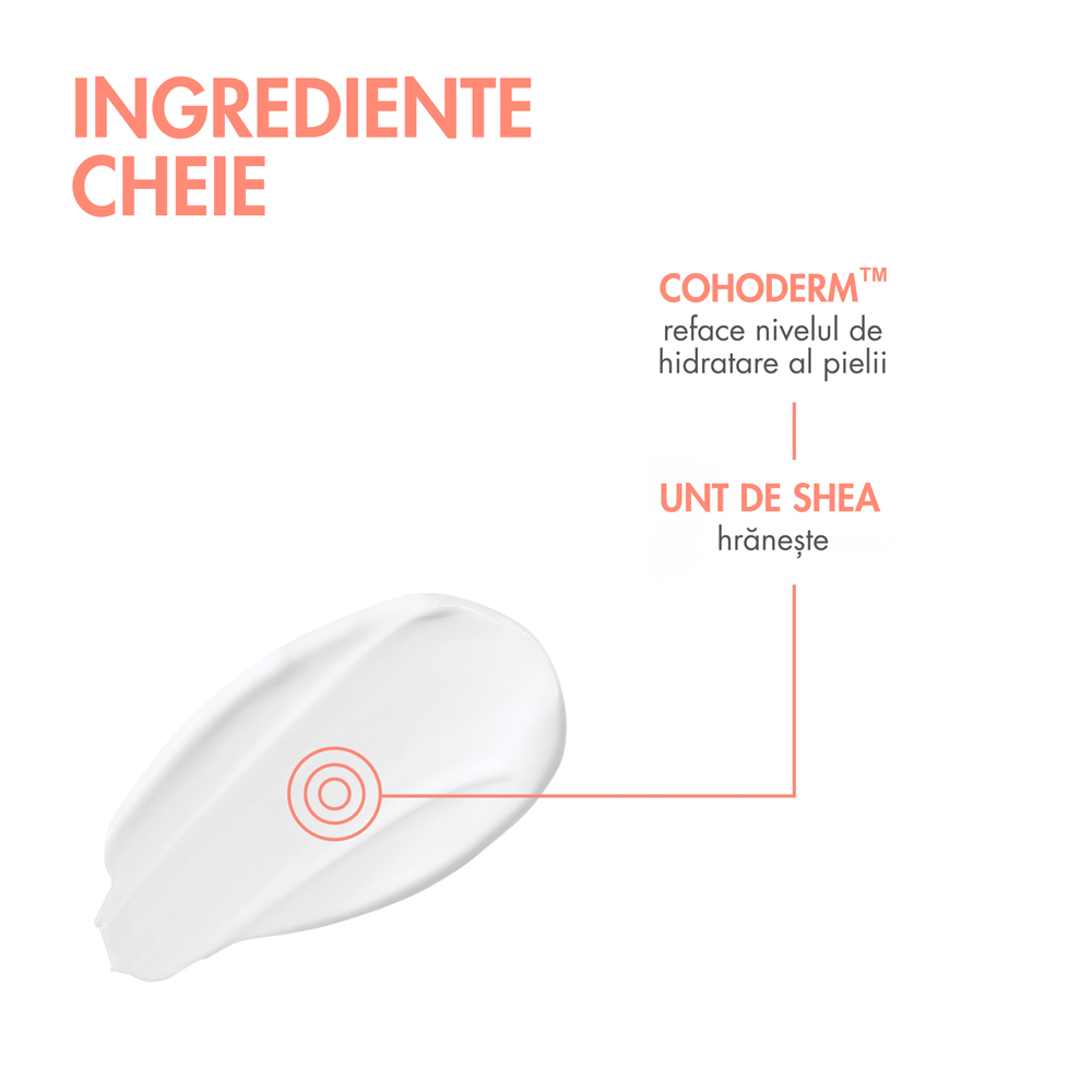 - contine Cohederm, complex brevetat de ingrediente active, care: hidrateaza intens si fortifica pielea redandu-i hidratarea naturala si protectia de bariera si ofera confort si calmare de durata pielii, prin refacerea rezervelor de apa, acum concentrate in apa termala Avene, recunoscuta pentru proprietatile sale anti-iritante;