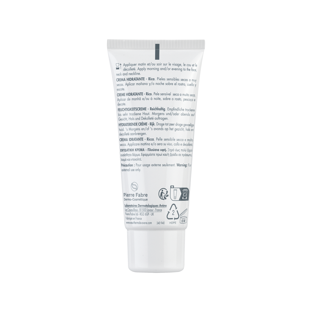 Ingrediente:Avene Thermal Spring Water (Avene Aqua). Mineral Oil (Paraffinum Liquidum). Glycerin. Isohexadecane. Dimethicone. Cetearyl Alcohol. Carthamus Tinctorius (Safflower) Seed Oil (Carthamus Tinctorius Seed Oil). Isocetyl Stearoyl Stearate. Triethylhexanoin. Glyceryl Stearate. Peg-100 Stearate. 1,2-hexanediol. Butyrospermum Parkii (Shea) Butter (Butyrospermum Parkii Butter). Cetearyl Glucoside. Benzoic Acid. Fragrance (Parfum). Phytosterols. Polyacrylate-13. Polyisobutene. Polysorbate 20. Sodium Hydroxide. Sorbitan Isostearate. Water (Aqua). Xanthan Gum