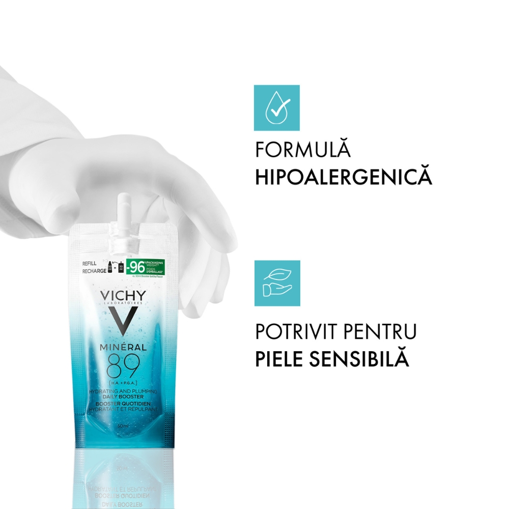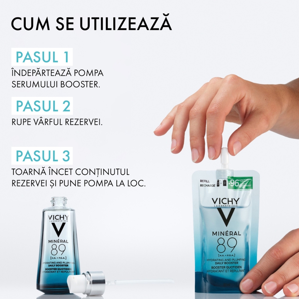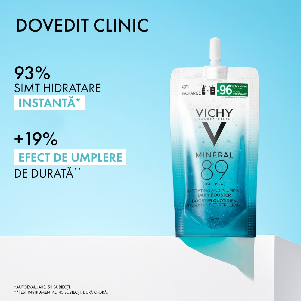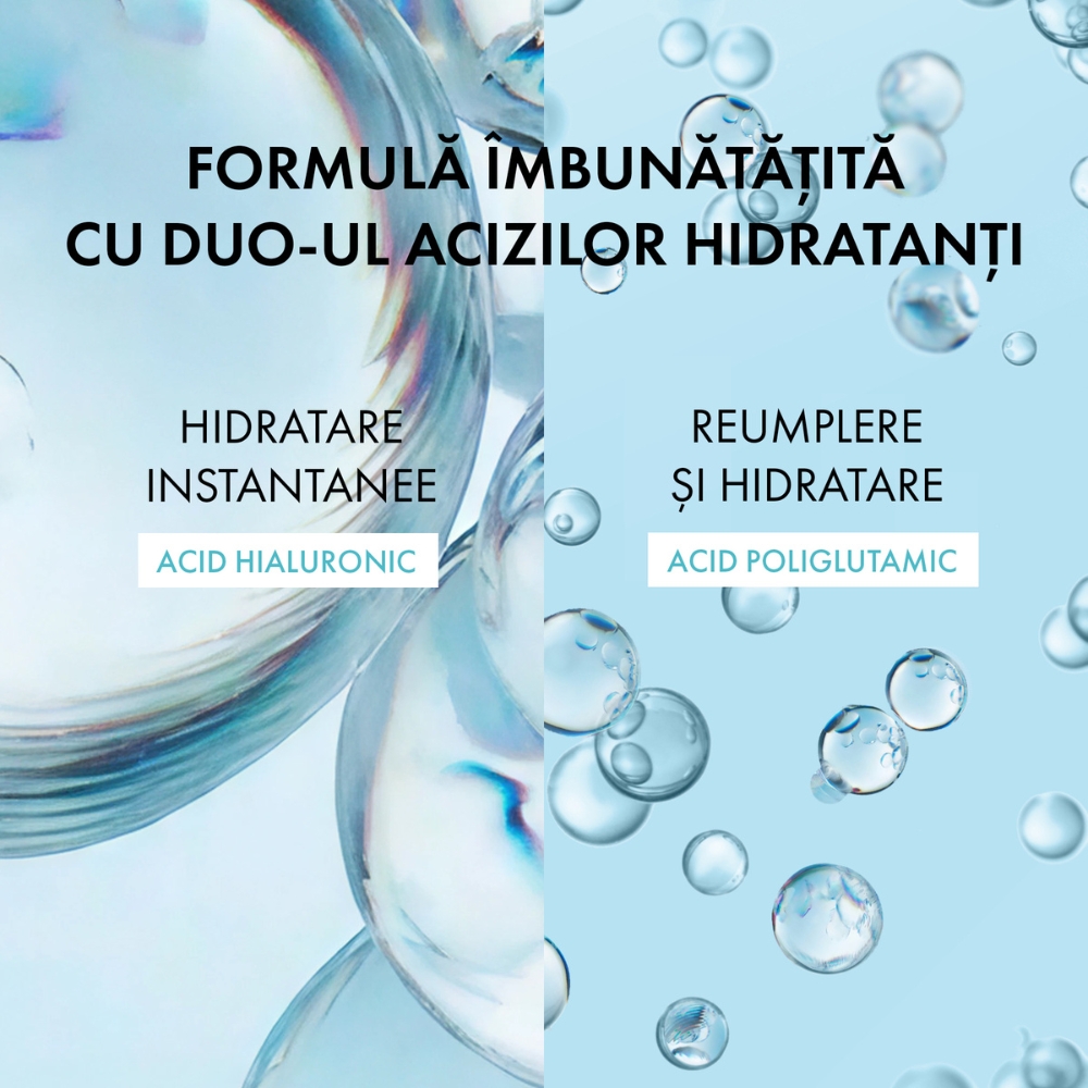 - formula emblematica cu 89% apa vulcanica Vichy, acum imbunatatita cu duo-ul de acizi hidratanti pentru o dubla eficacitate: 93% simt hidratare instantanee;