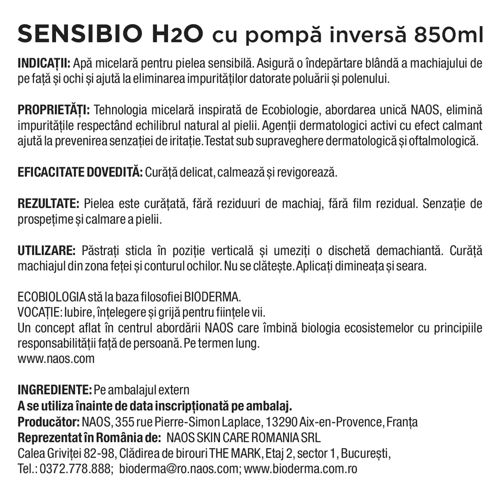 - micelele din formula sa atrag si capteaza impuritatile mentinand in acelasi timp echilibrul cutanat (fara sapun, pH fiziologic);