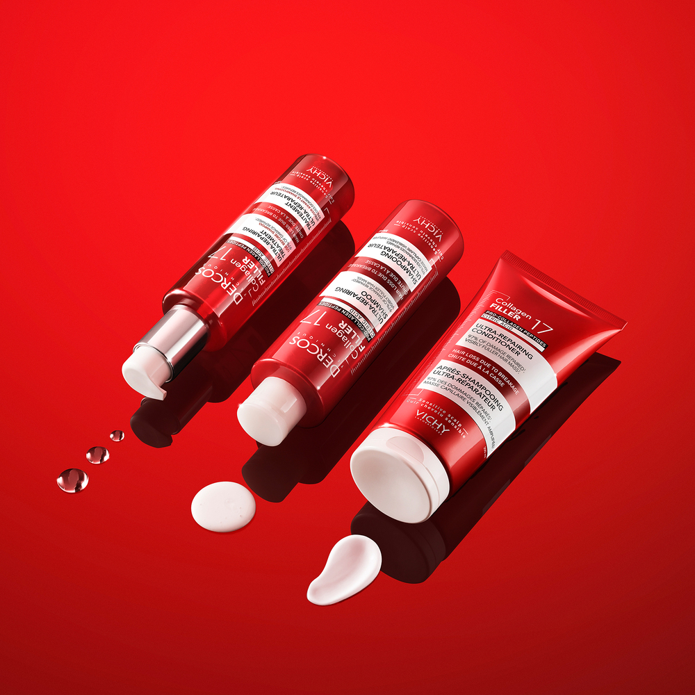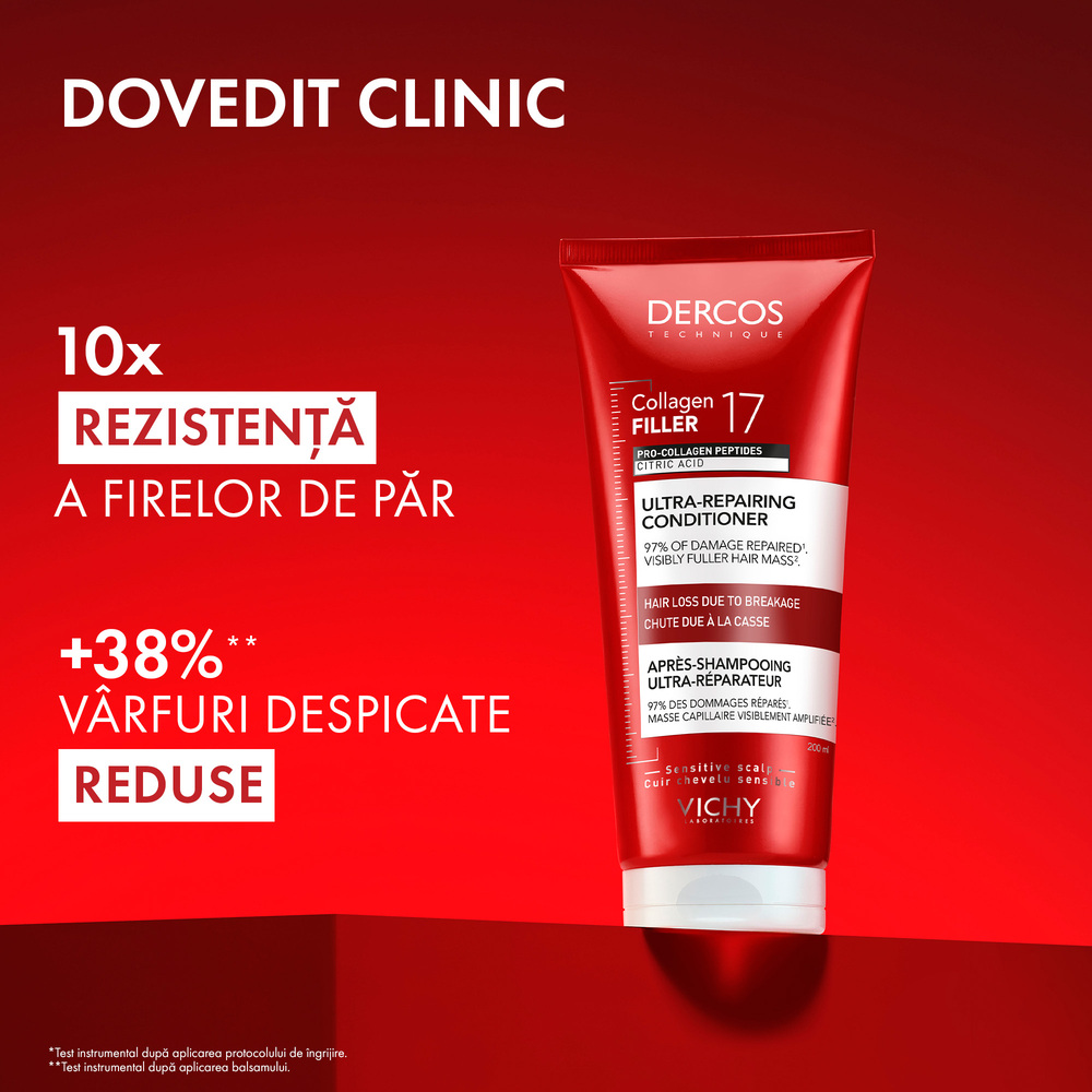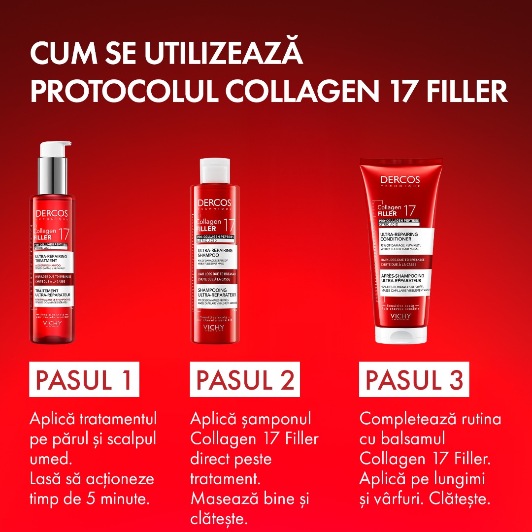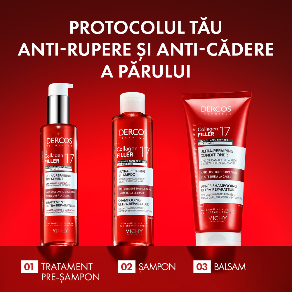 Descoperă inovația Dercos pentru un păr puternic și plin de volum! Collagen 17 Filler este prima rutină ultra-reparatoare, îmbogățită cu Peptide Pro-Colagen și Acid Citric, care acționează profund pentru a repara fibra capilară și a stimula producția naturală de Colagen 171.