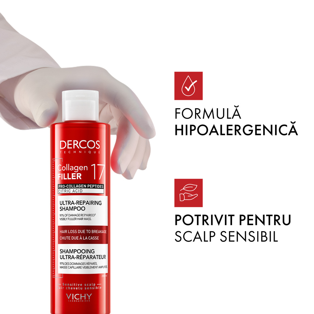 Descoperă inovația Dercos pentru un păr puternic și plin de volum! Collagen 17 Filler este prima rutină ultra-reparatoare, îmbogățită cu Peptide Pro-Colagen și Acid Citric, care acționează profund pentru a repara fibra capilară și a stimula producția naturală de Colagen 171.