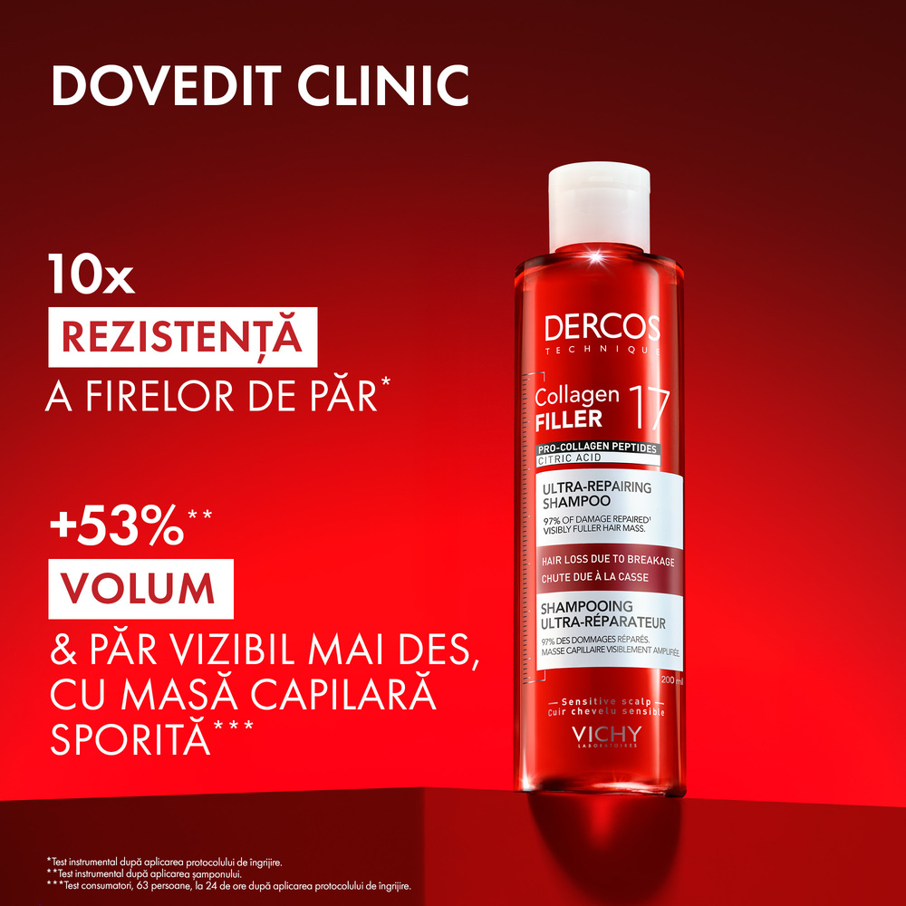 Șamponul Dercos Collagen 17 Filler, cu Peptide Pro-Colagen și Acid Citric, pentru fortifierea părului. Oferă până la de 10 ori mai multă rezistență a firelor de păr2 și până la +53% volum3 cu o masă capilară sporită4. Repară părul deteriorat și previne căderea cauzată de rupere. Potrivit tuturor tipurilor de păr, testat dermatologic.