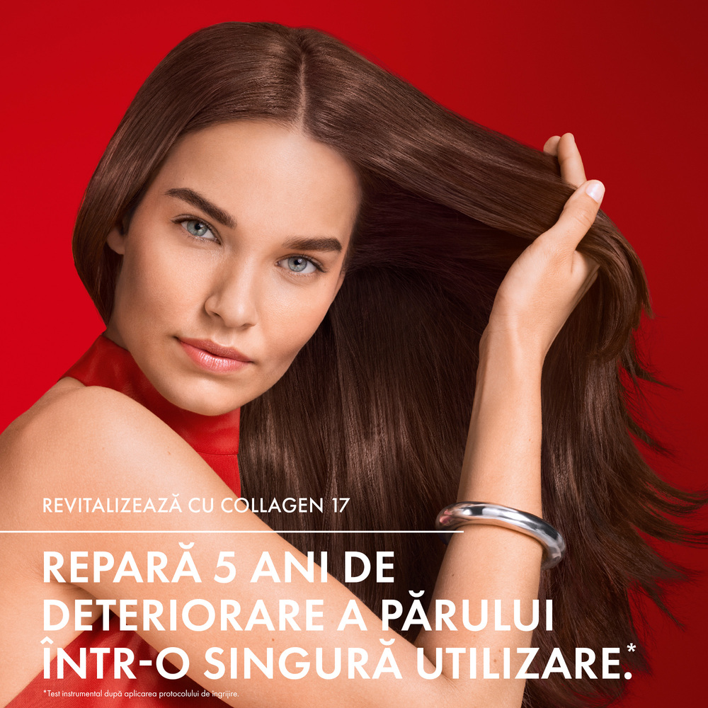 - sampon ultra-reparatoar, imbogatit cu peptide Pro-Colagen si acid citric, care actioneaza profund pentru a repara fibra capilara si a stimula productia naturala de Colagen 17*;