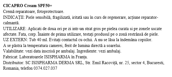 - Cicapro Cream SPF50+ este o crema fotoprotectoare cu actiune reparator-calmanta, creata pentru pielea fragilizata, iritata sau in curs de regenerare;