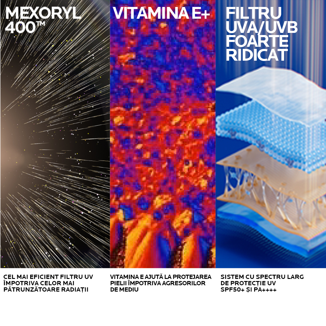 - formula combina tehnologia Mexoryl 400, ce ofera protectie impotriva celor mai penetrante radiatii UV, cu Vitamina E, care protejeaza pielea impotriva agresorilor de mediu;
