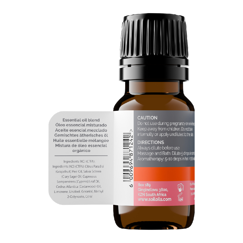Contine un amestec exclusiv de uleiuri esentiale relaxante, pure, organice de Grapefruit, Salvie, Chiparos si lemn de Cedru.