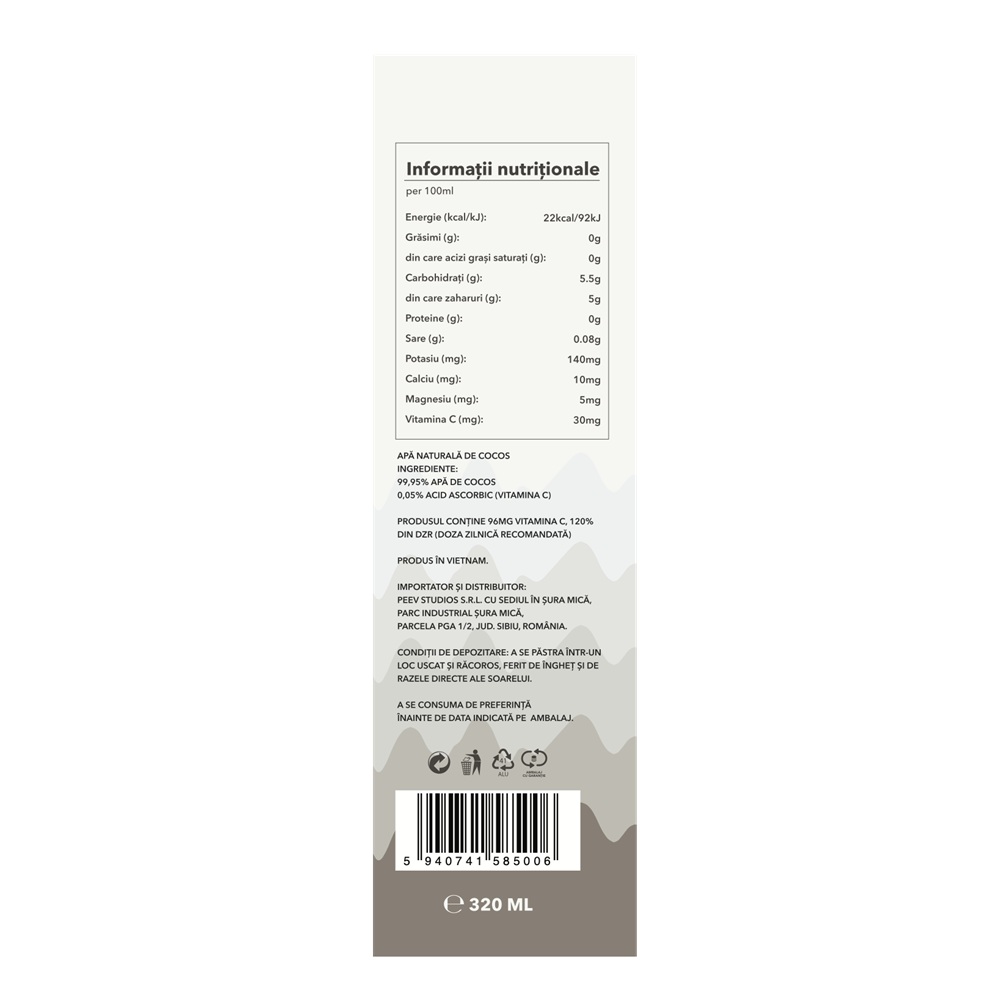 99.95% apă de cocos, 0.05% acid ascorbic (vitamina C).