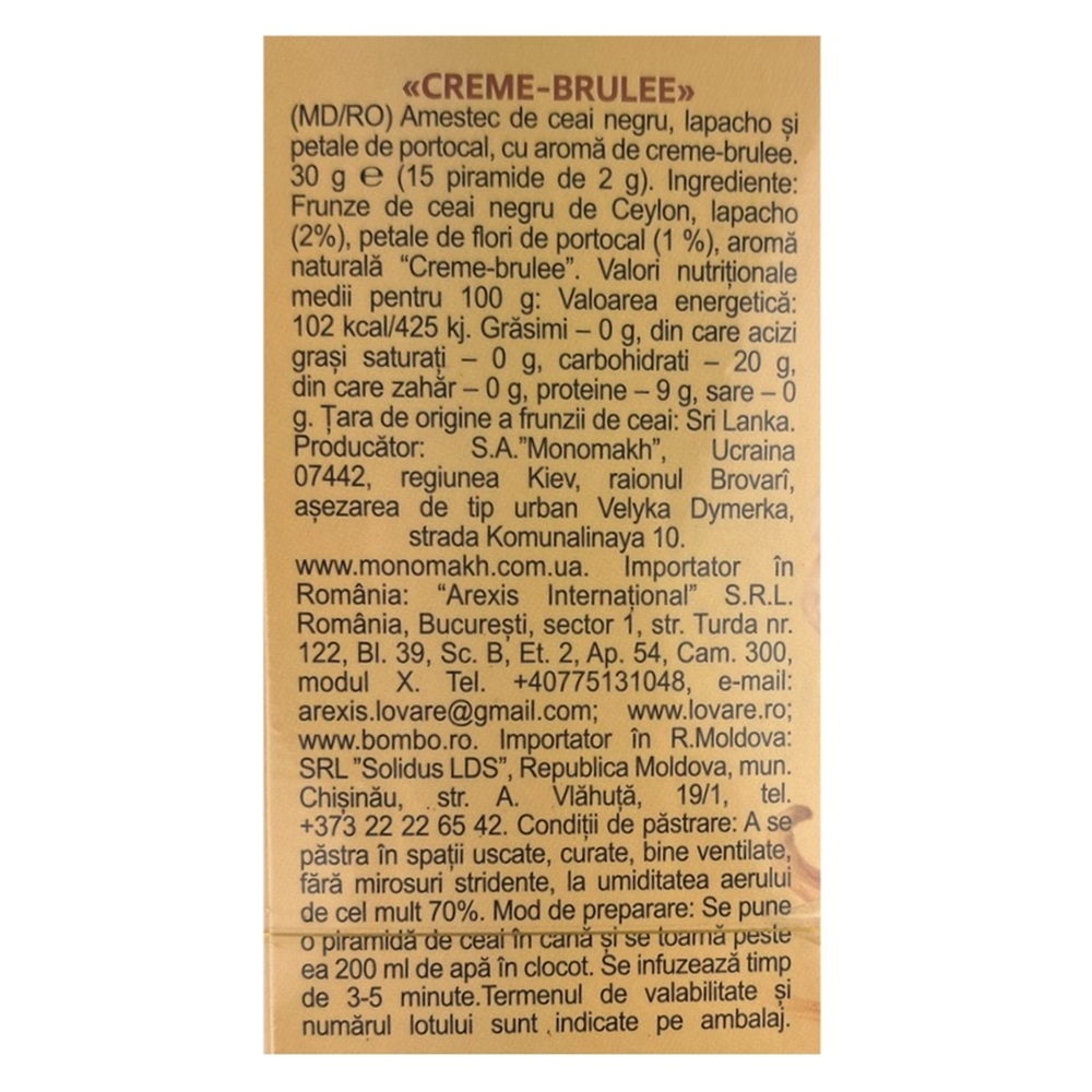 Frunze de ceai negru de Ceylon, Lapacho (2%), Petale de flori de portocal (1%), Aroma naturala creme-brulee.