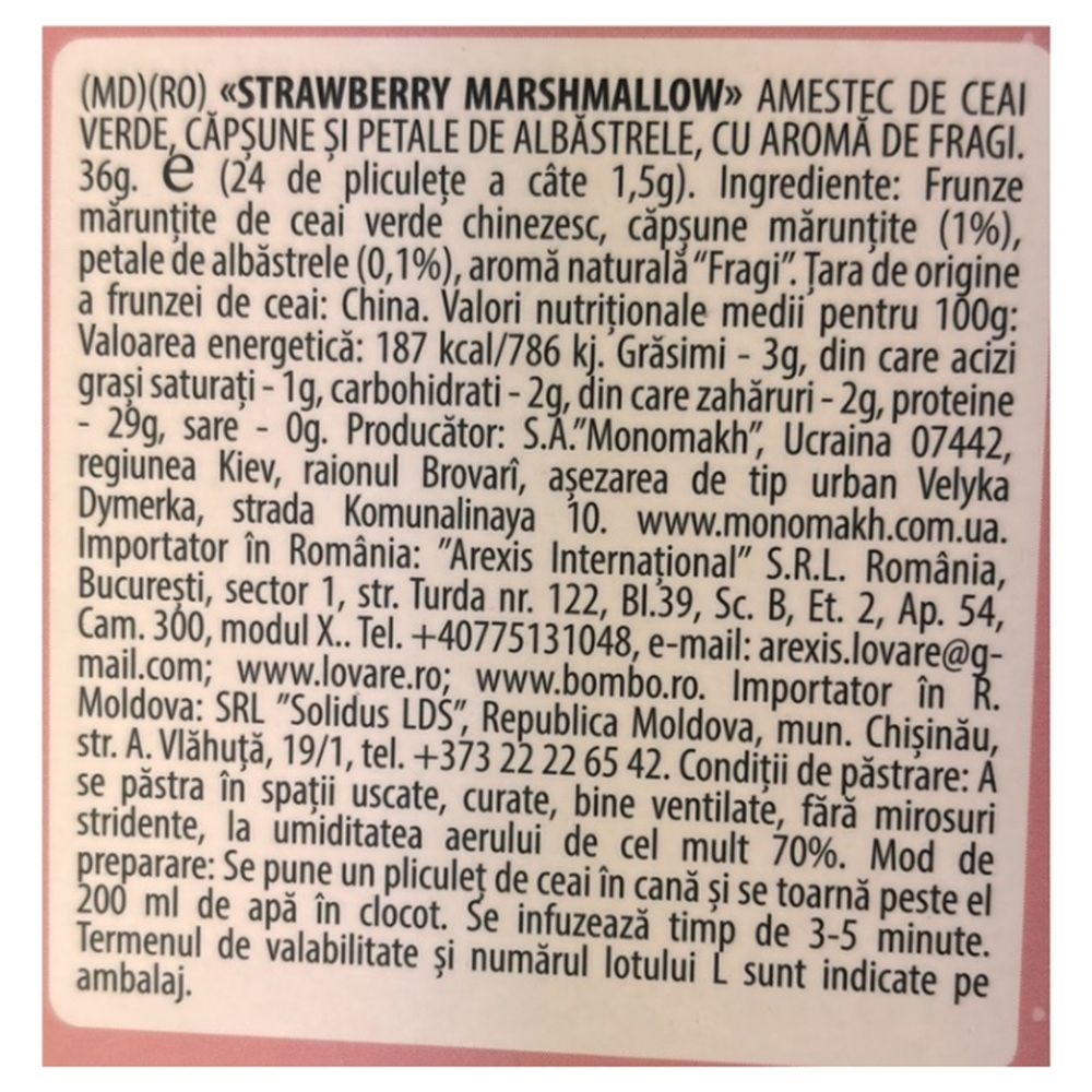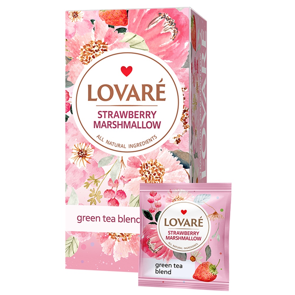 Amestec de ceai verde, fragute si petale de albastrele, cu aroma de fragi Strawberry Marshmallow, 24 plicuri x 2 g, Lovare [4820198879853]