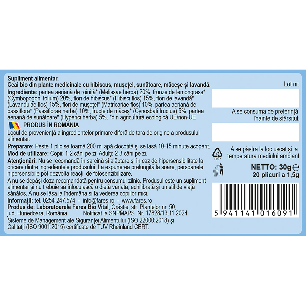 Partea aeriană de roiniță* (Melissae herba) 20%, frunze de lemongrass* (Cymbopogoni folium) 20%, flori de hibiscus* (Hibisci flos) 15%, flori de lavandă* (Lavandulae flos) 15%, flori de mușețel* (Matricariae flos) 10%, partea aeriană de passiflora* (Passiflorae herba) 10%, fructe de măceș* (Cynosbati fructus) 5%, partea aeriană de sunătoare* (Hyperici herba) 5%. *din agricultură ecologică UE/non-UE