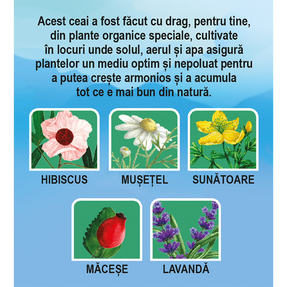Cu hibiscus, mușețel, sunătoare, măceșe și lavandă.