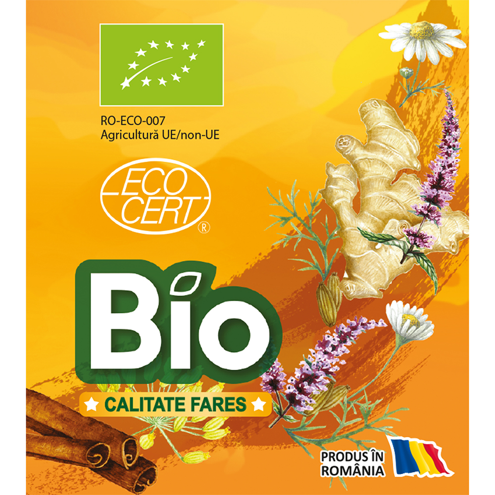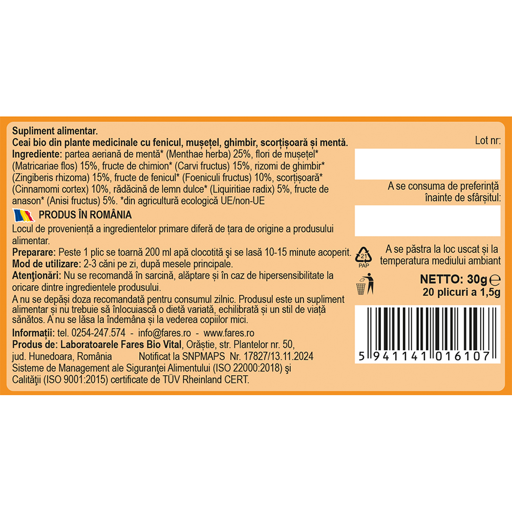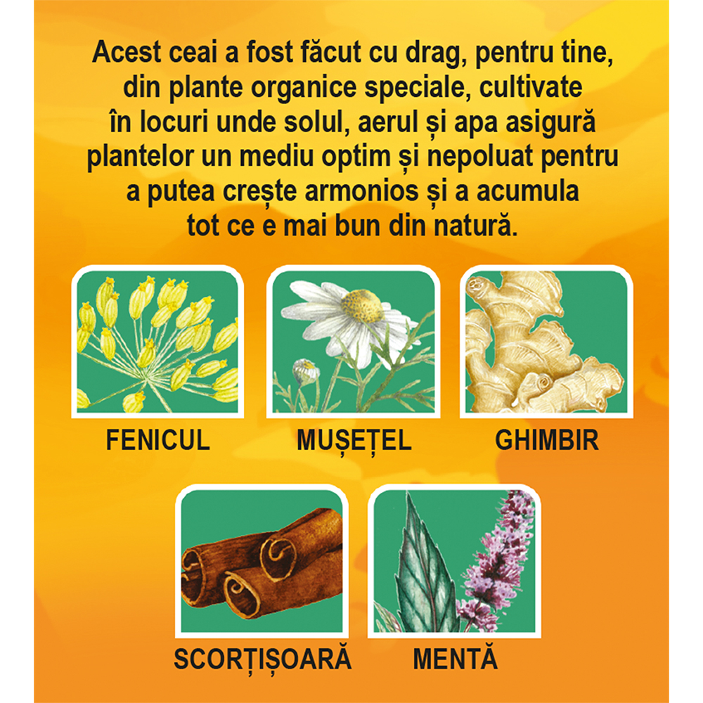 Partea aeriană de mentă* (Menthae herba) 25%, flori de mușețel* (Matricariae flos) 15%, fructe de chimion* (Carvi fructus) 15%, rizomi de ghimbir* (Zingiberis rhizoma) 15%, fructe de fenicul* (Foeniculi fructus) 10%, scorțișoară* (Cinnamomi cortex) 10%, rădăcină de lemn dulce* (Liquiritiae radix) 5%, fructe de anason* (Anisi fructus) 5%. *din agricultură ecologică UE/non-UE