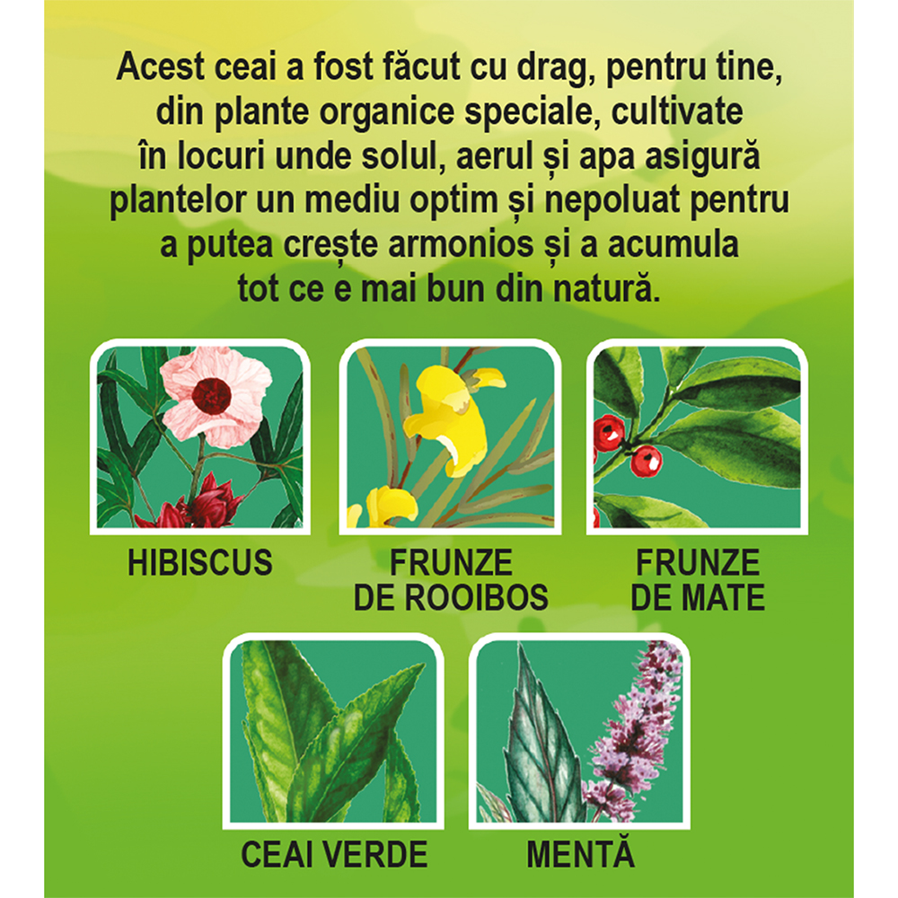 Cu hibiscus, rooibos, mate, ceai verde și mentă.