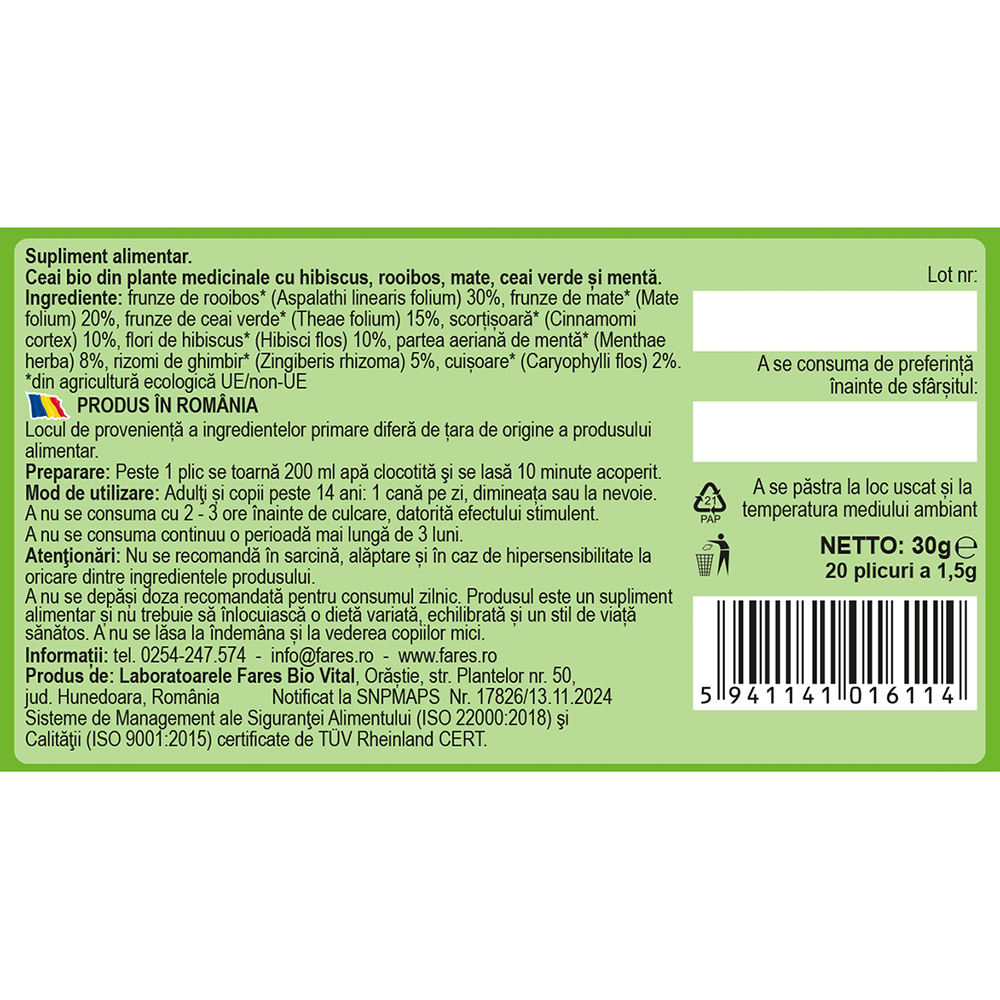 Frunze de rooibos* (Aspalathi linearis folium) 30%, frunze de mate* (Mate folium) 20%, frunze de ceai verde* (Theae folium) 15%, scorțișoară* (Cinnamomi cortex) 10%, flori de hibiscus* (Hibisci flos) 10%, partea aeriană de mentă* (Menthae herba) 8%, rizomi de ghimbir* (Zingiberis rhizoma) 5%, cuișoare* (Caryophylli flos) 2%. *din agricultură ecologică UE/non-UE