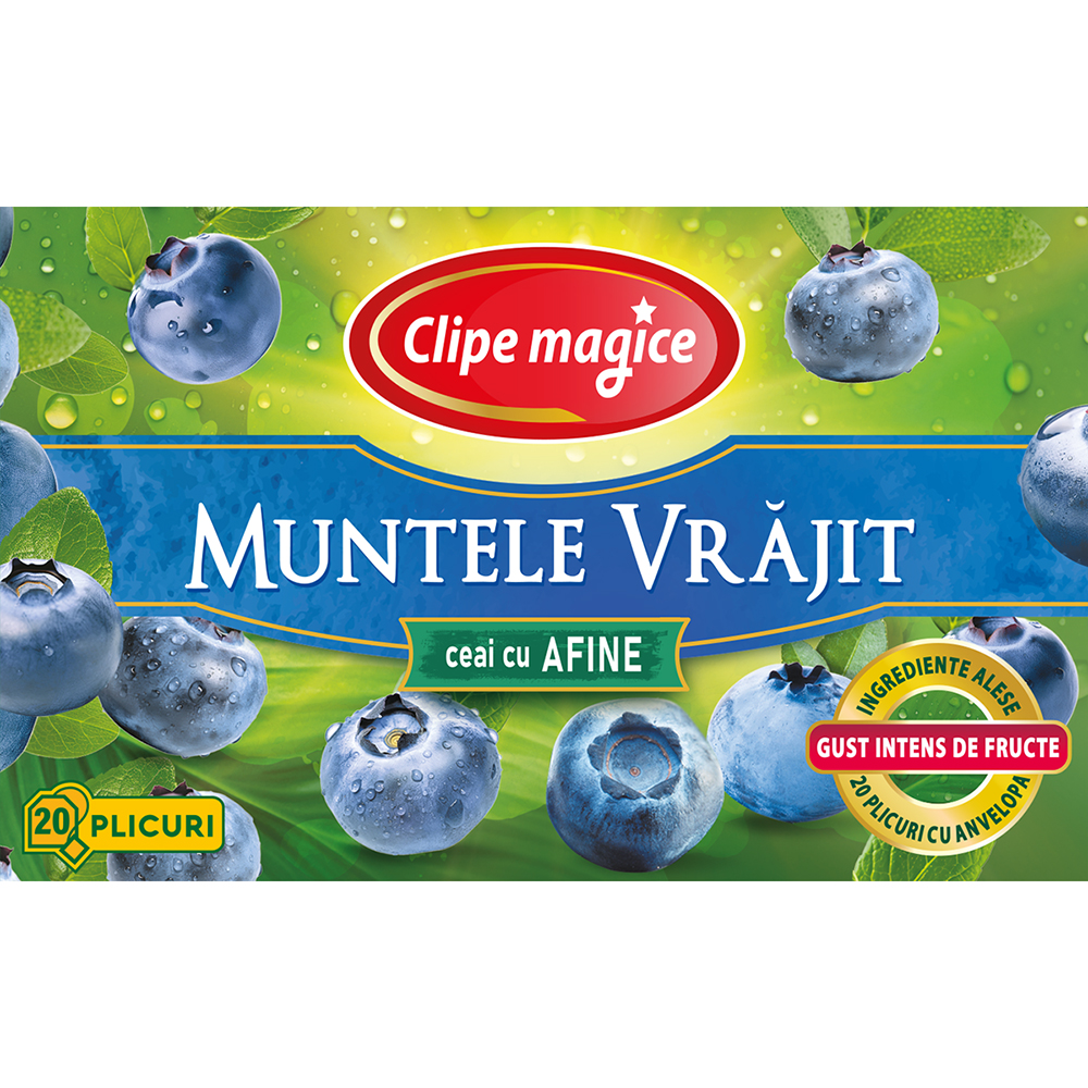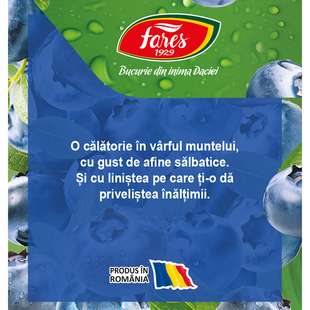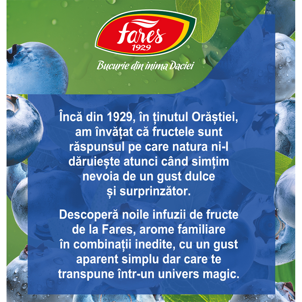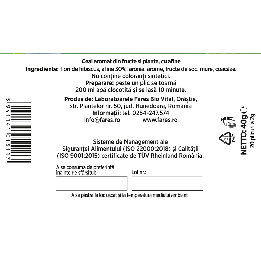Ingrediente:Flori de hibiscus, afine 30%, aronia, arome, fructe de soc, mure, coacăze.
