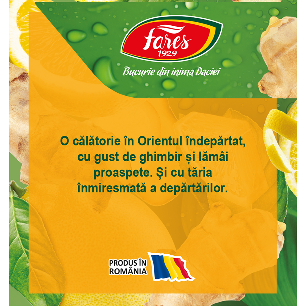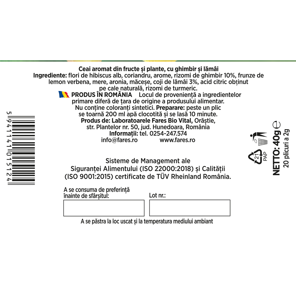 Ingrediente:Flori de hibiscus alb, coriandru, arome, rizomi de ghimbir 10%, frunze de lemon verbena, mere, aronia, măceșe, coji de lămâi 3%, acid citric obținut pe cale naturală, rizomi de turmeric.
