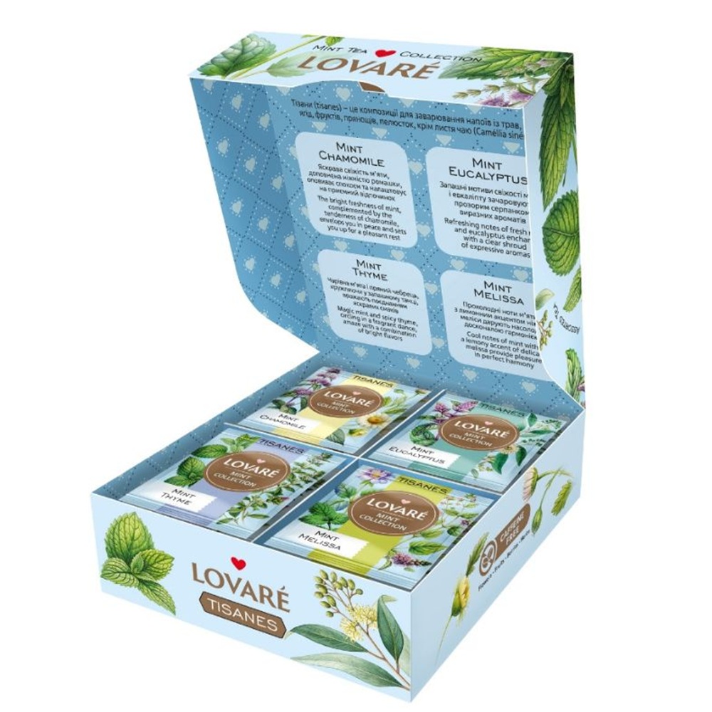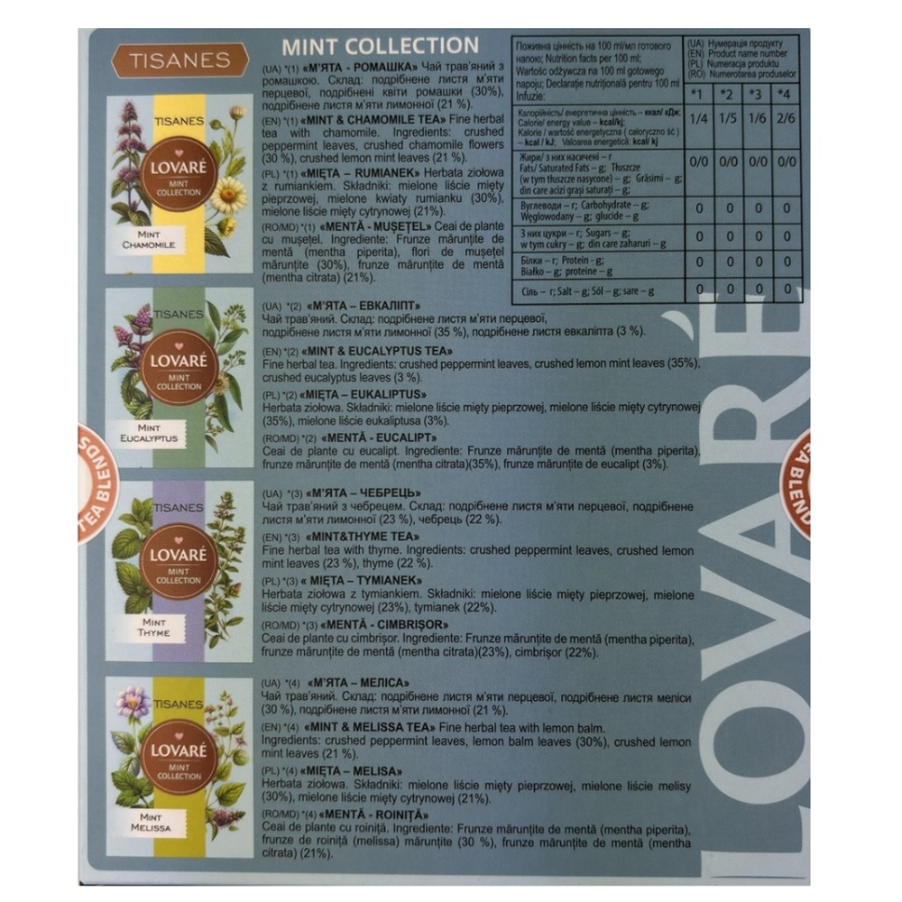 Frunze maruntite de menta (mentha piperita), Flori de musetel maruntite (30%), Frunze maruntite de menta (mentha citrata) (21%).