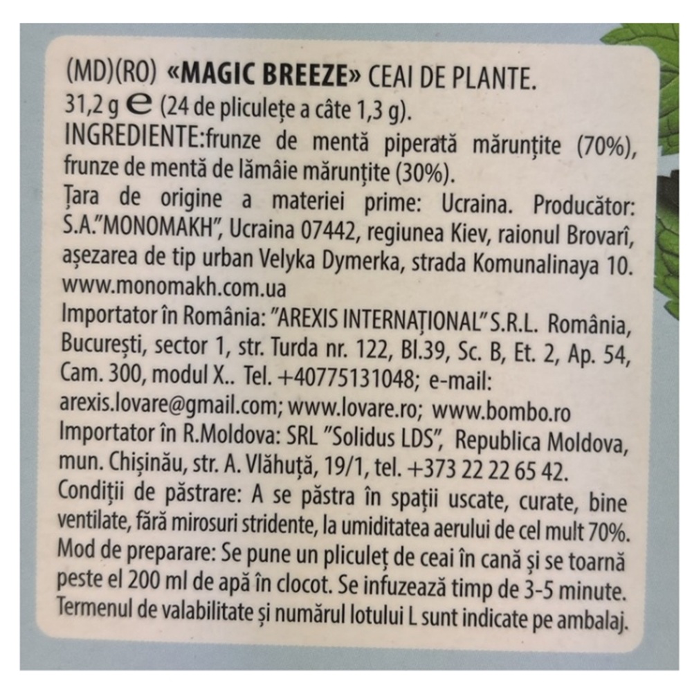 Frunze de menta maruntite (70%), frunze de menta-lamaita maruntite (30%).
